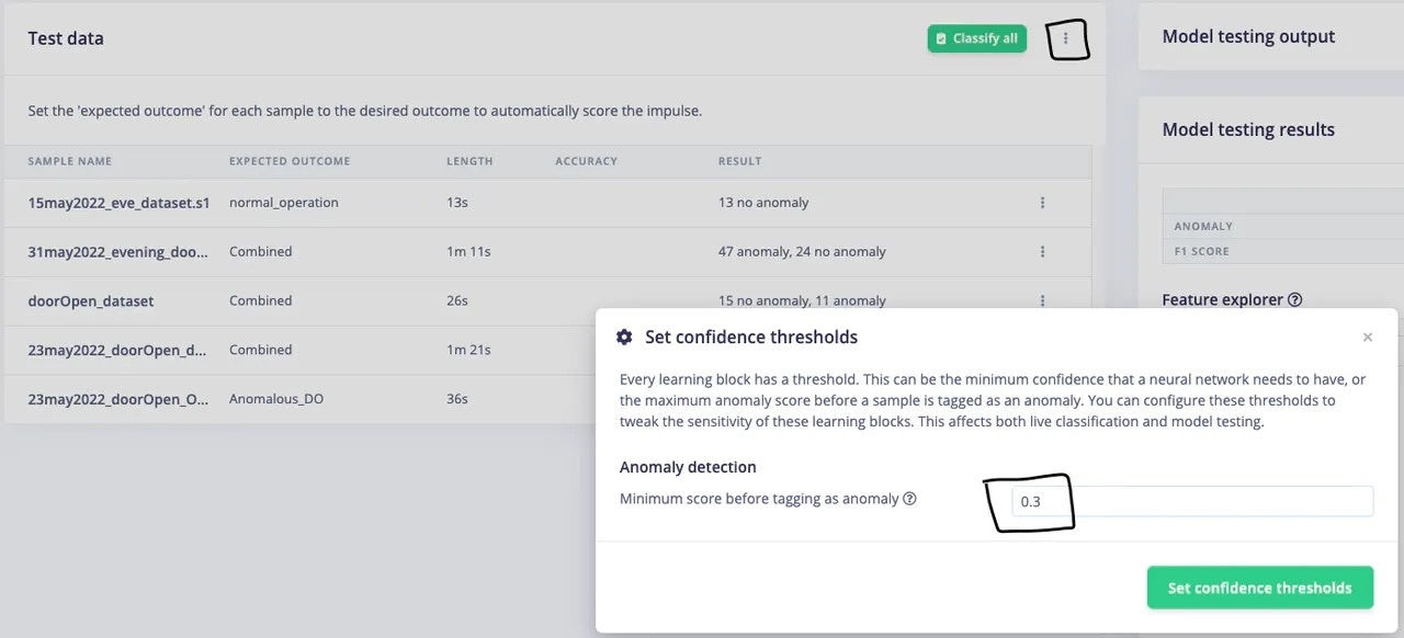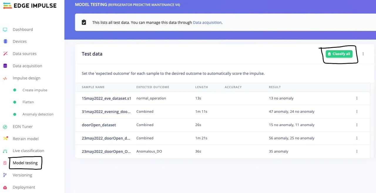 For testing the ML model, Edge Impulse provides two methods: a) Model testing b) Live classification In this project, I have primarily used the model testing method because I already had a lot of data captured. In the data acquisition tab, I assigned some data as test data, which are only used in the model testing.