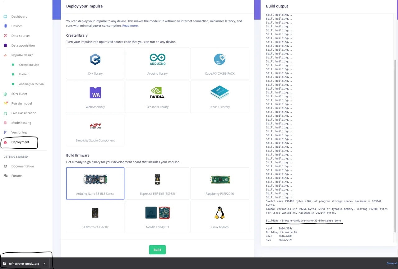 Edge Impulse fully supports the Arduino Nano BLE sense development board, so the best way to deploy this ML model would be to build firmware.