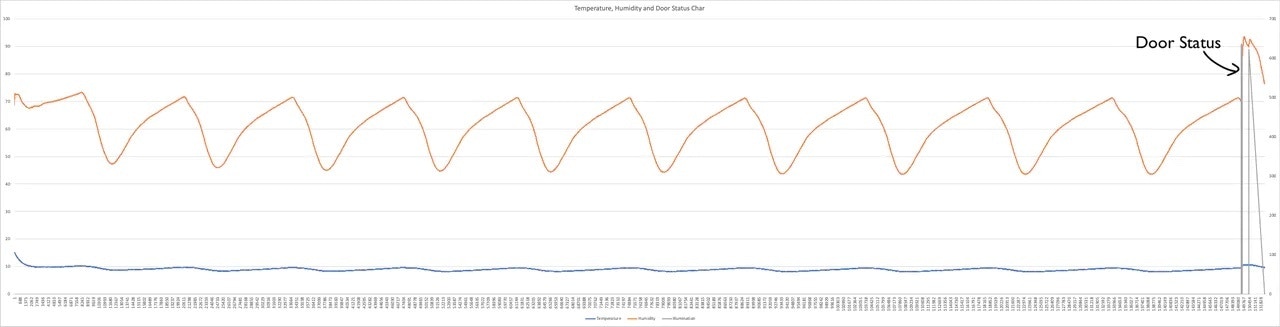 The Arduino BLE sense records temperature, humidity and illumination reading every 200ms. The illumination data is used to detect when the fridge door is open. If illumination is greater than 0, then the fridge door is open.