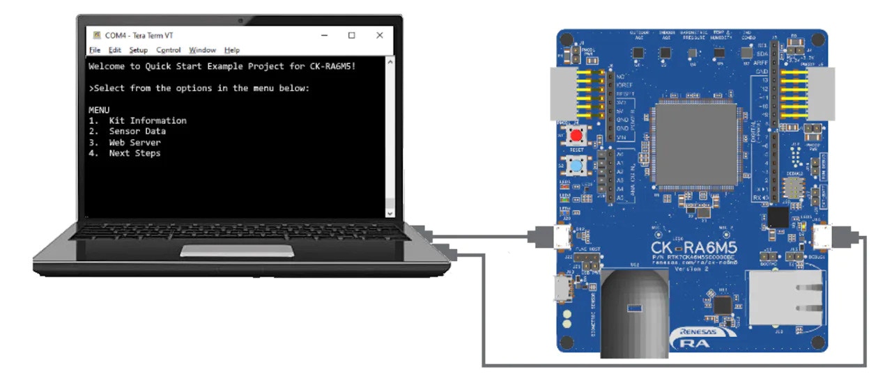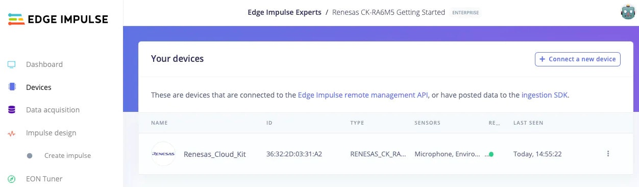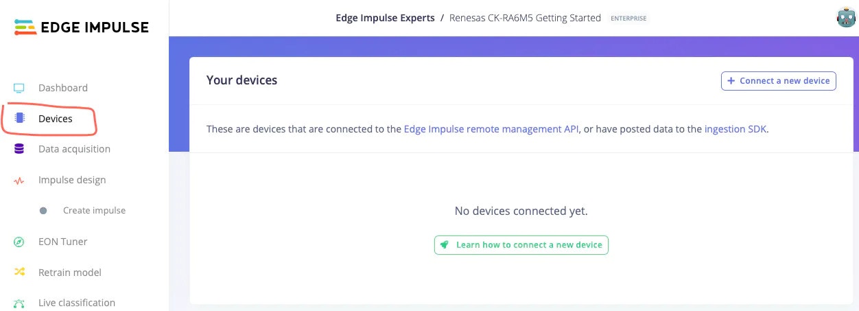 The next step is connecting our Renesas CK-RA6M5 board to the Edge Impulse Studio, so we can ingest sensor data for the machine learning model. Please follow the below steps to do so:- Connect the Renesas CK-RA6M5 board to the computer by following the steps mentioned in the Quick Start section.