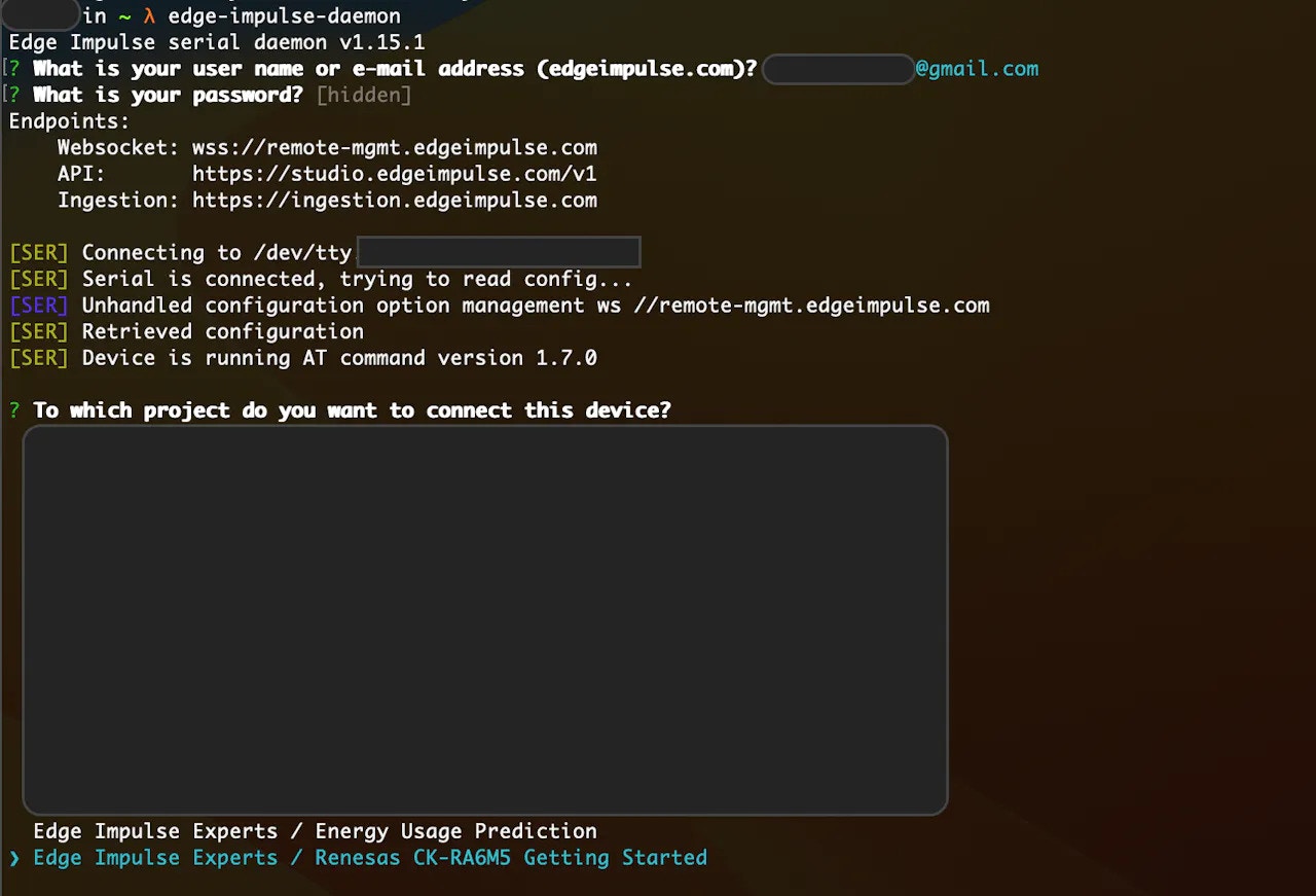 edge-impulse-daemon. The Edge Impulse serial daemon will start and prompt for user credentials. - After providing user credentials, it will prompt you to select an Edge Impulse project. Please navigate and select the project created in the previous steps, using the arrow keys.