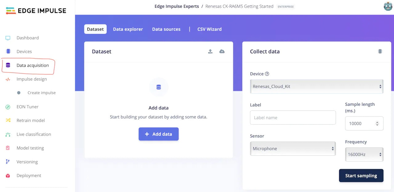 - Navigate to the Data Acquisition tab in the Edge Impulse Studio.