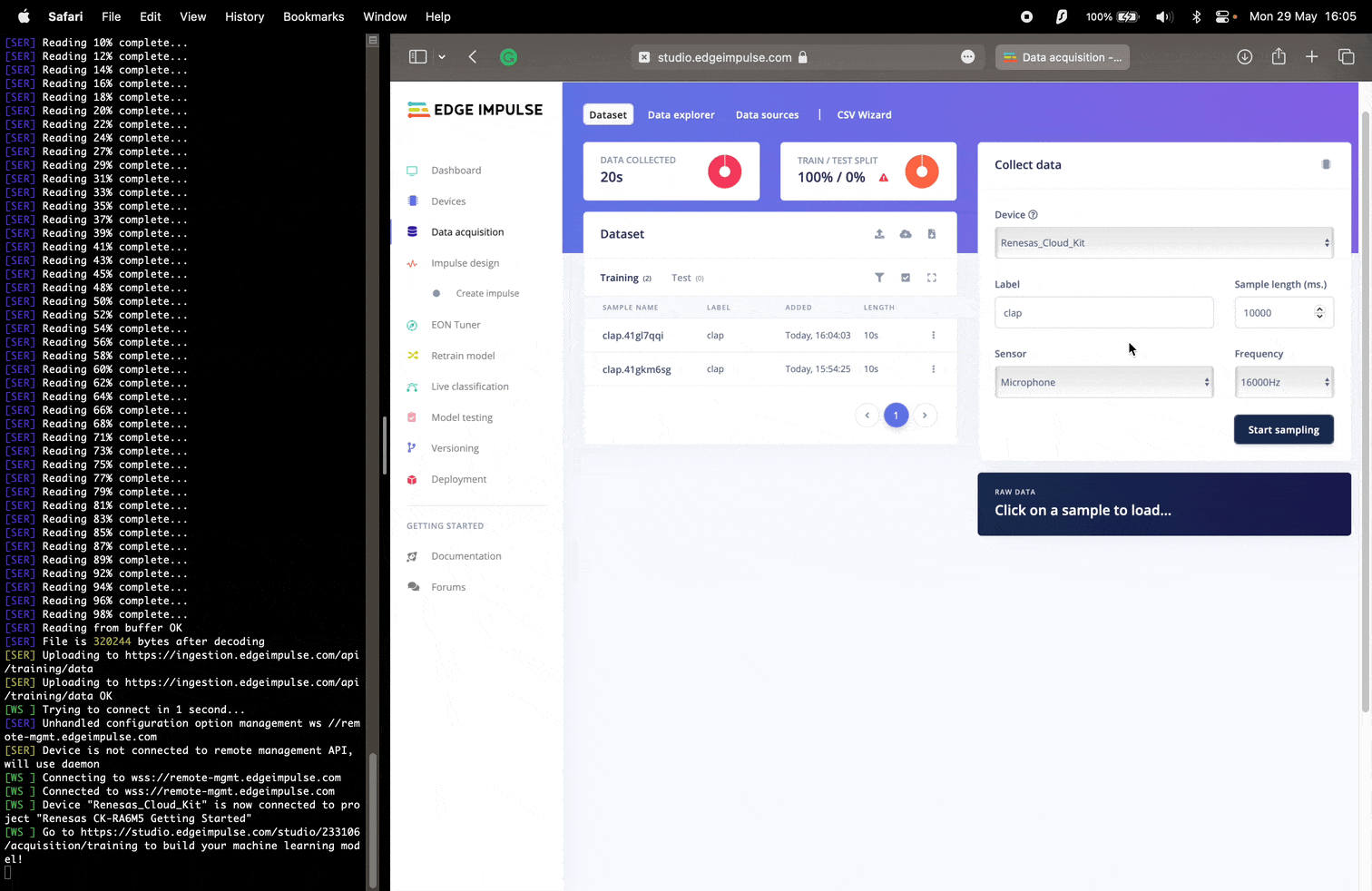Edge Impulse provides multiple options for data acquisition. In this Getting Started Guide, we will look at the direct data ingestion from the board usingedge-impulse-daemon. Please follow the below steps for data acquisition: