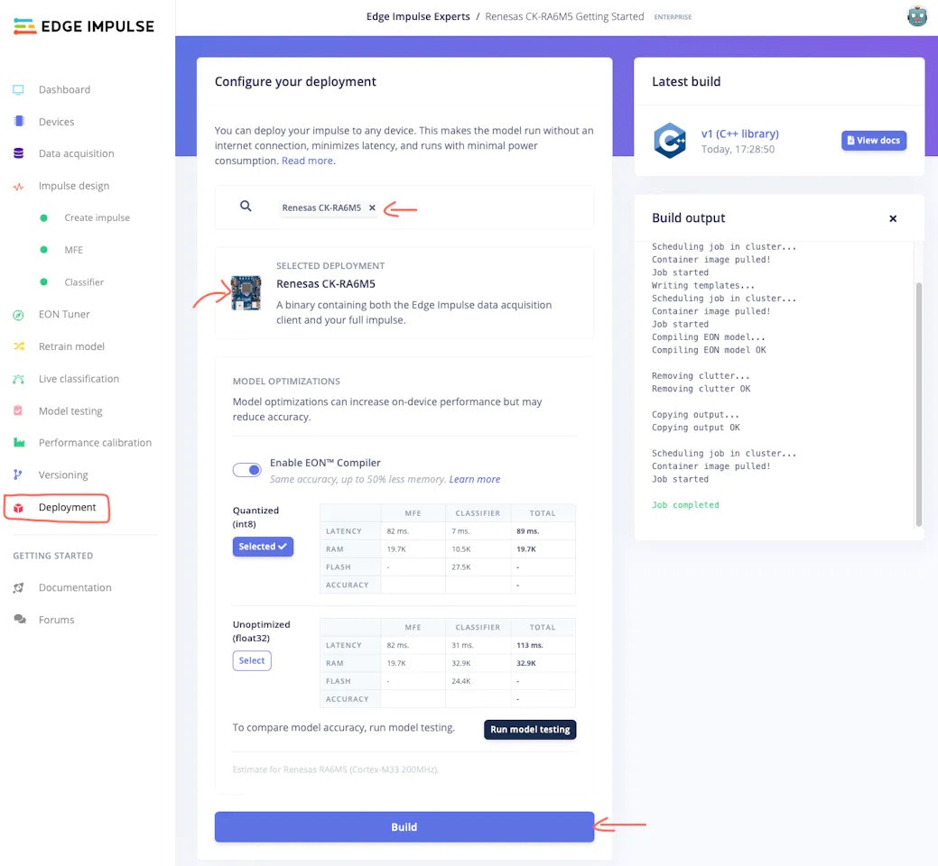 In this step, we will deploy our prepared model to the Renesas CK-RA6M5 board, so we can perform inference locally on the board.- Please navigate to the Deployment tab, select the Renesas CK-RA6M5 board using the search bar, and click on the Build button.