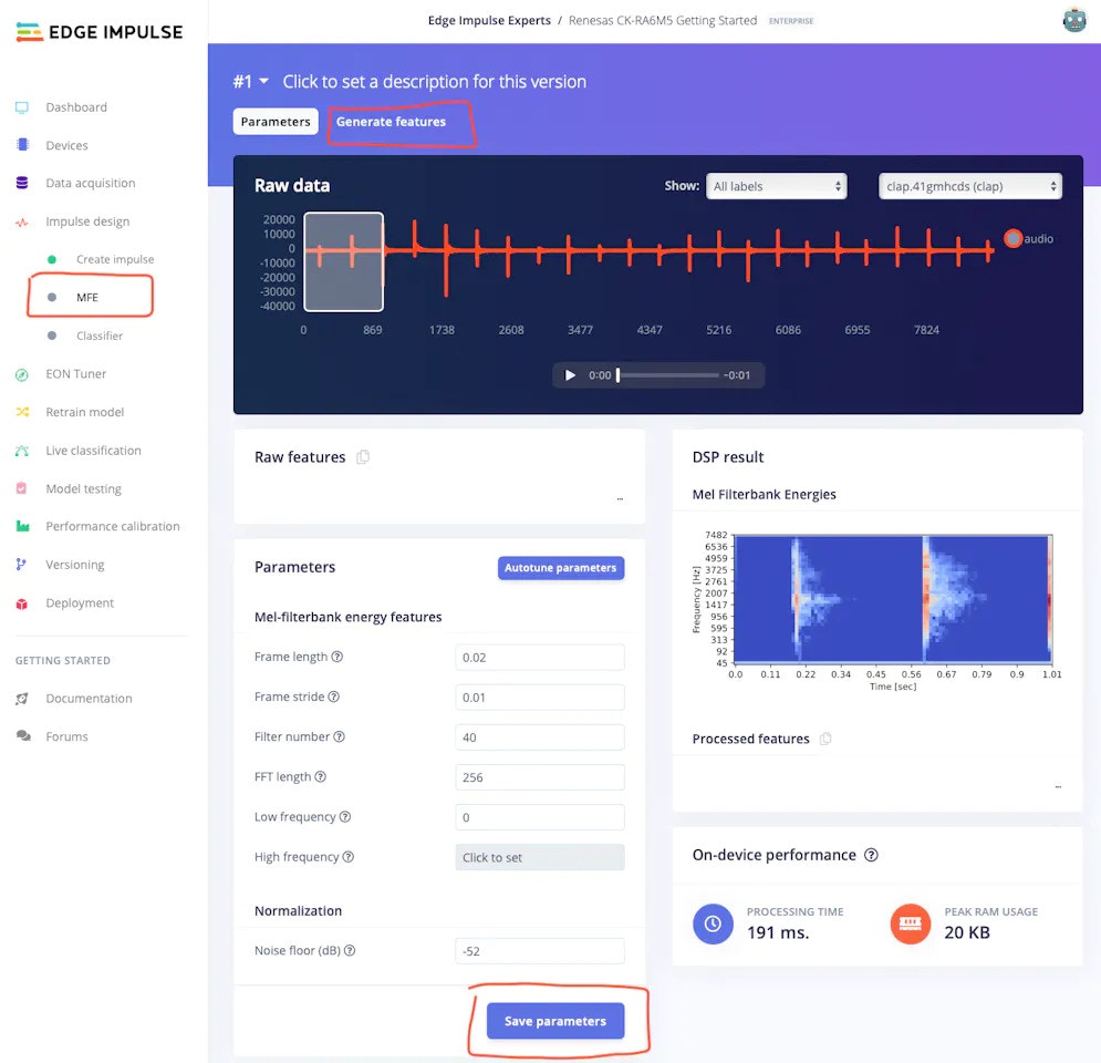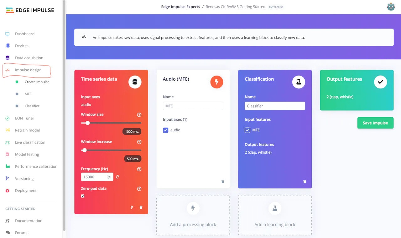 - After Impulse design is complete, save the design and navigate to the preprocessing tab (MFE in this case) for the feature generation.