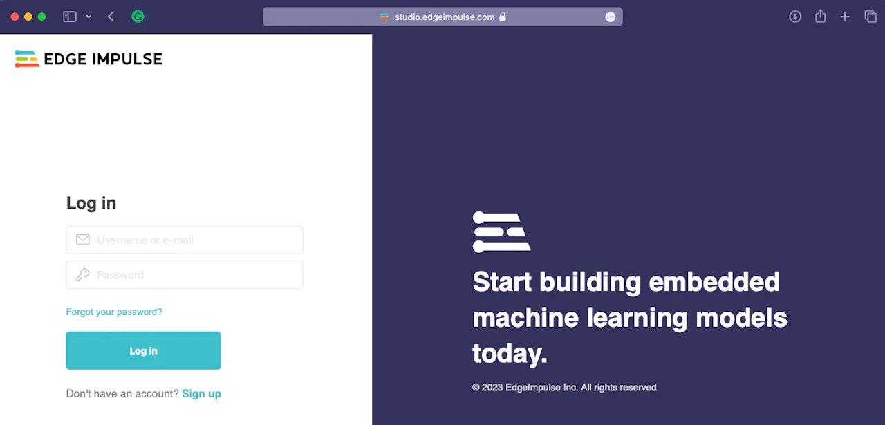 To begin, you’ll need to create an Edge Impulse account and a project in the Edge Impulse Studio. Please follow the below steps to do so:- Navigate to the Edge Impulse Studio and create an account. If you already have an account then please login using your credentials.