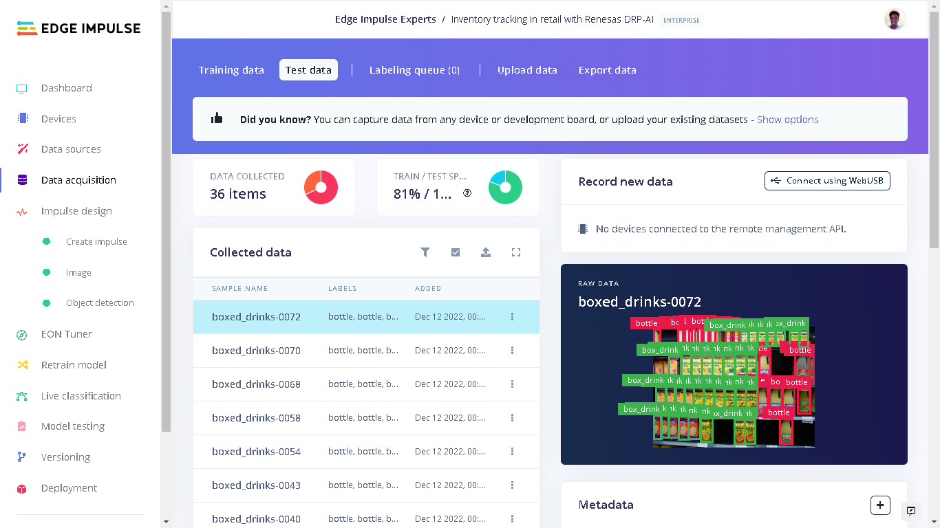 The primary method of inventory management in retail, warehouse, manufacturing, and logistics is simply counting parts or stock. This procedure ensures that the inventory on the sales floor, or in the warehouse meets requirements for production, sale, or spare capacity. In retail, this is done to ensure there are enough goods available for sale to consumers. Even with many technology advancements and improved production and capacity planning, physical inventory counting is still required in the modern world. This is a time consuming and tedious process, but machine learning and computer vision can help decrease the burden of physical inventory counting. To demonstrate the process of inventory counting, I trained a machine learning model that can identify a bottle and a box/carton drink on store shelves, and their counts are displayed in a Web application. For the object detection component, I used Edge Impulse to label my dataset, train a YOLOv5 model, and deploy it to the Renesas RZ/V2L Evaluation Board Kit. You can find the public Edge Impulse project here: Inventory Tracking in Retail with Renesas DRP-AI.Dataset Preparation