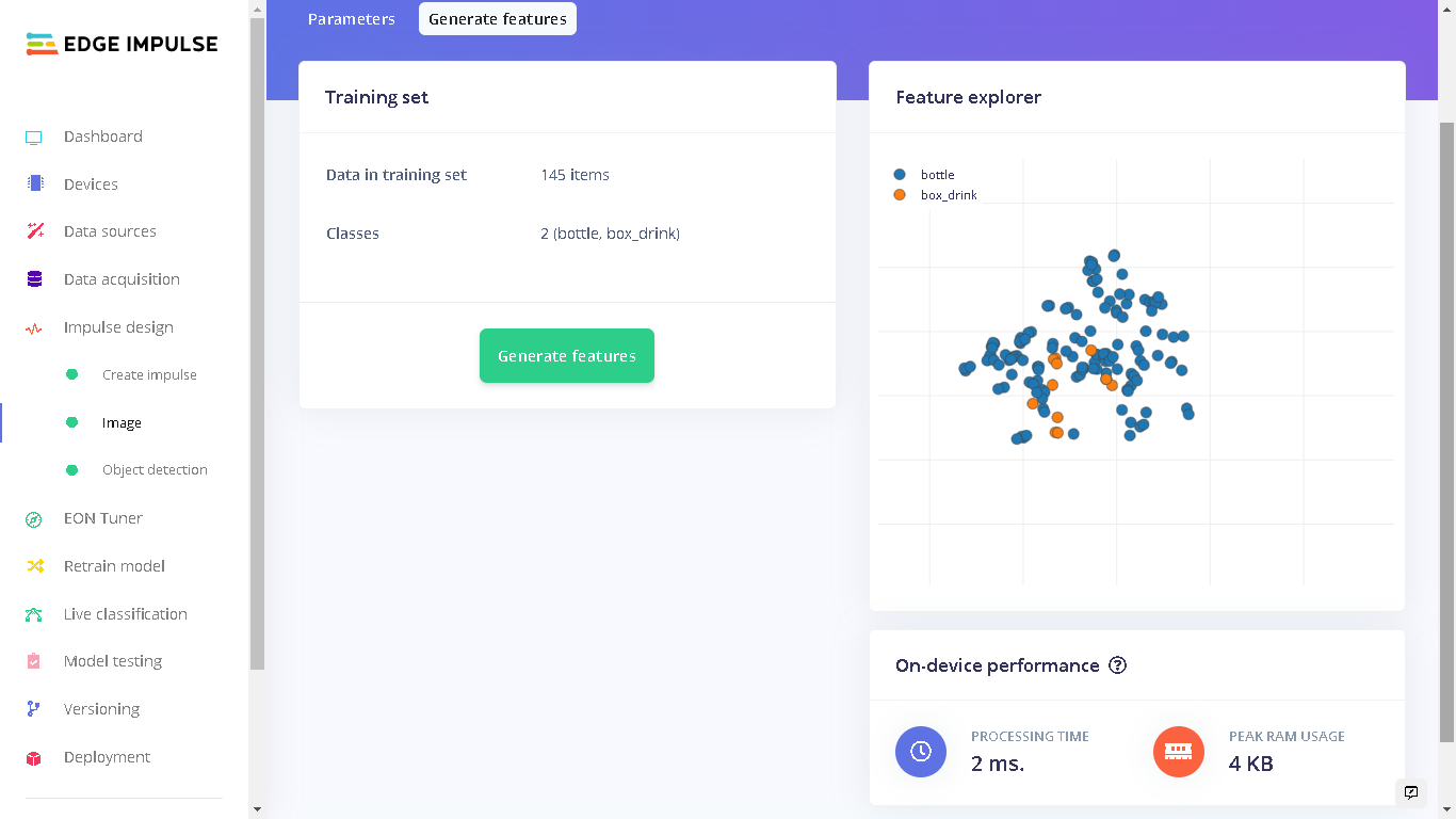 An Impulse is a machine learning pipeline that indicates the type of input data, extracts features from the data, and finally includes a neural network that trains on the features from your data. For my YOLOv5 model, I used an image width and height of 320 pixels and the “Resize mode” set to “Squash”. The processing block was set to “Image” and the learning block set to “Object Detection (Images)”.