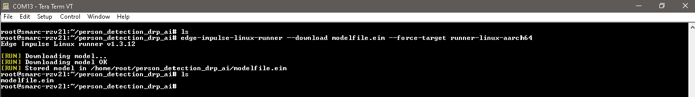 We can also download an executable of the model which contains the signal processing and ML code, compiled with optimizations for the processor, plus a very simple IPC layer (over a Unix socket). This executable is called an .eim model