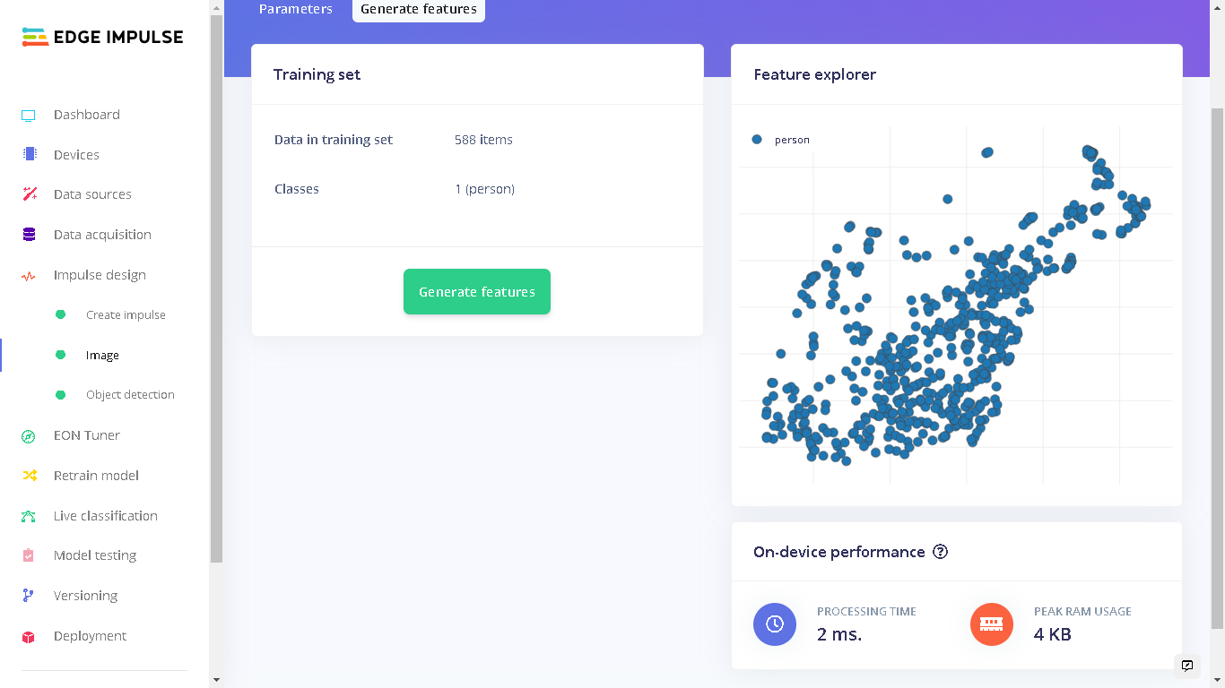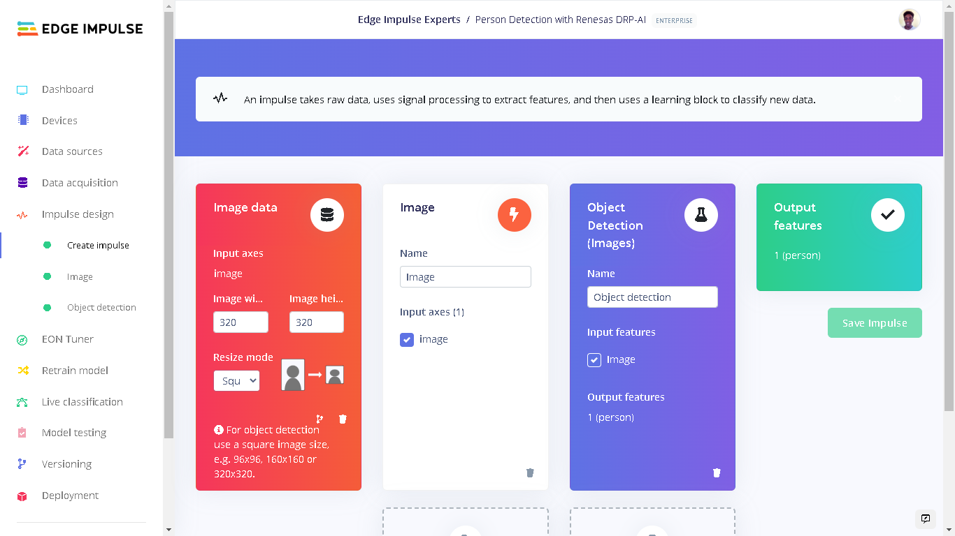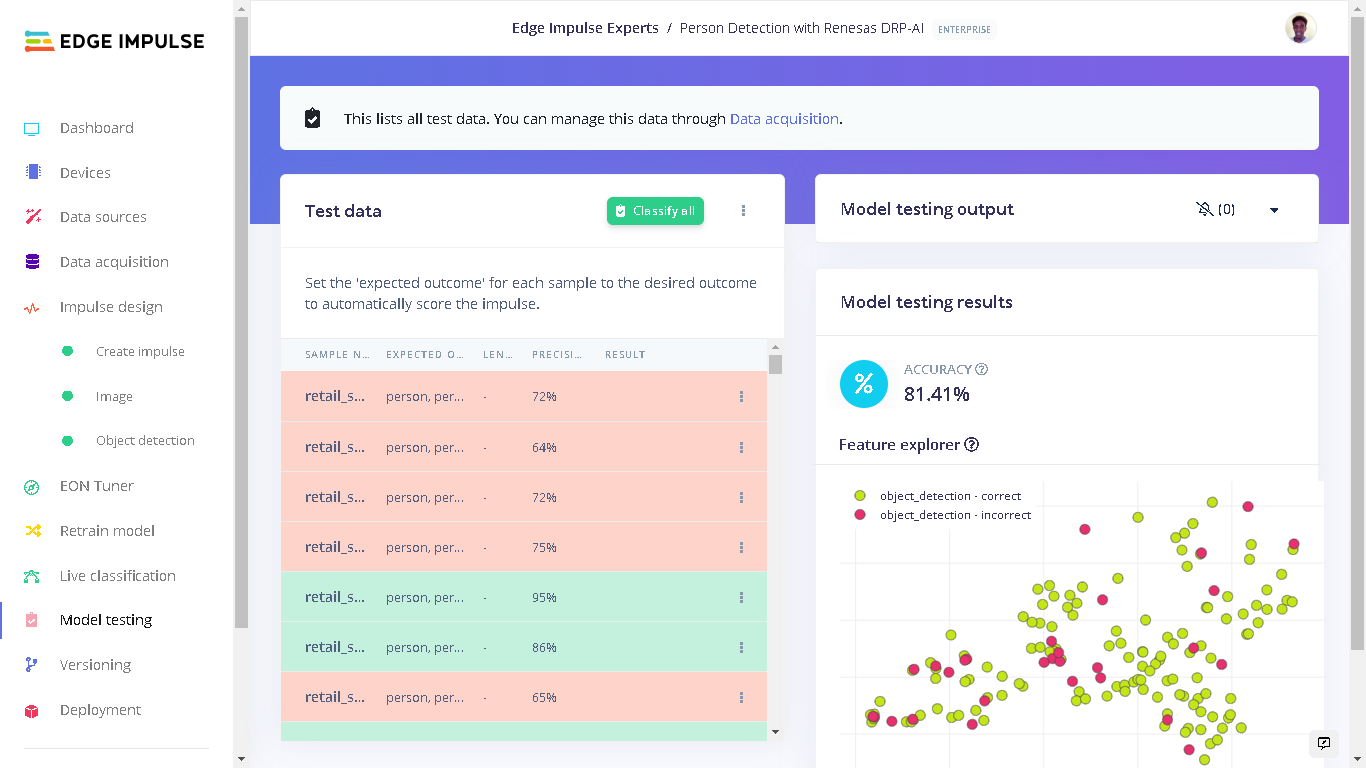 Currently, all Edge Impulse models can run on the RZ/V2L CPU which is an SoC based on Cortex-A55 cores. In addition, you can bring your own model to Edge Impulse and use it on the device. However, if you would like to benefit from the DRP-AI hardware acceleration support, there are a couple of models that you can use for both object detection and image classification. In the midst of the rapid evolution of AI, Renesas developed the AI accelerator (DRP-AI) and the software (DRP-AI translator) that delivers both high performance and low power consumption, and has the ability to respond to evolution. Combining the DRP-AI and the DRP-AI translator makes AI inference possible with high power efficiency.- Performance with RZ/V2L CPU - I first trained another model but with the target device being RZ/V2L (CPU). Afterwards, I downloaded the