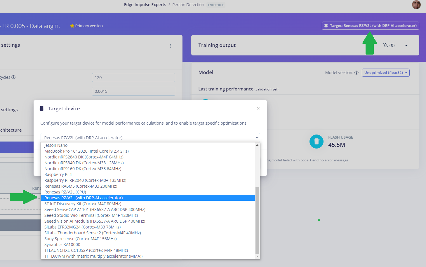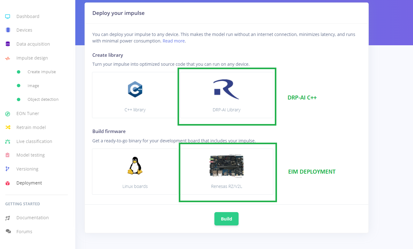 To add DRP-AI support in your ML projects with Edge Impulse, all that is needed is to select the Renesas RZ/V2L (with DRP-AI accelerator) target from the Target selection menu in the Edge Impulse Studio. This invoke the DRP-AI Translator tool and input file generation automatically behind the scenes while also ensuring it works with your custom model.