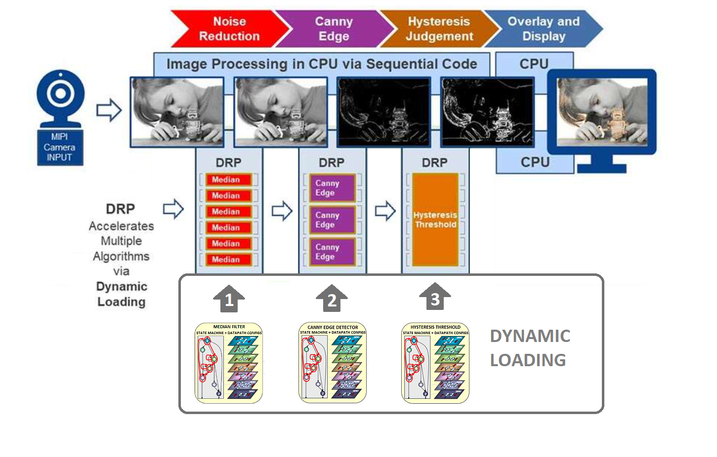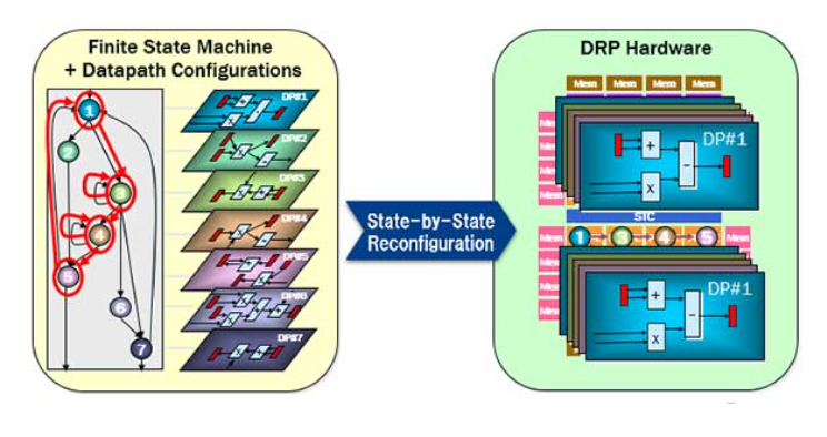 Renesas is a leading producer of a variety of specialized Microprocessor and Microcontroller solutions which are found at the heart of many industrial and consumers systems. Their RZ family of Microprocessors includes a range of Arm Cortex-A based multicore models targeting a wide range of applications from, industrial networking (RZ/N) and real time control (RZ/T), to general purpose/HMI and graphics applications (RZ/A, RZ/G) and finally AI-based computer vision applications (RZ/V). At the heart of the AI focused RZ/V MPU series is Renesas’ own DRP-AI ML accelerator. DRP-AI is a low power high performance ML accelerator that was designed around Renesas Dynamic Reconfigurable Processor (DRP) technology originally created to accelerate computer vision applications with DRP being especially useful in speeding up pre and post processing of image data in a computer vision pipeline. A traditional CPU has fixed data paths and algorithms are implemented by instructions or software written by a developer to manipulate how these fixed data paths are used. DRP is a form of reprogrammable hardware that is able to change its processing data paths during run time. This capability is referred to as its Dynamic Reconfiguration feature which enables DRP to provide the optimal hardware based implementation of an algorithm adapting its computing path ways to implement the algorithm in the most efficient way possible. The data path configuration that is loaded into the DRP specifies the operations and interconnections that the DRP will implement in hardware. DRP contains a Finite State Machine known as a State Transition Controller (STC) that manages the data path configuration in hardware and allows for changing out of data path configurations during run time.