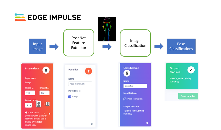 Edge Impulse has created a feature processing block that contains a pretrained PoseNet model. This Posenet block produces body keypoints as features from input images instead of producing raw scaled image data features as is normally image classification models. To train this model you need to capture images of different poses and label the images according to the poses.