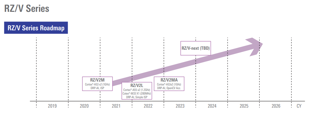 DRP-AI is built into the RZ/V MPU family which includes a range of models designed for image processing, AI and general purposes applications with new parts being added in future.