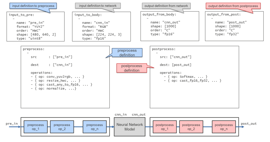 To directly utilize DRP-AI Translator the process requires additional configuration files to be provided with the ONNX model files to enable DRP AI to create the necessary configuration files to setup the DRP-AI hardware to execute your model. The additional input files are created in YAML and you need to provide Pre and Post Processing definition files together with an address map: