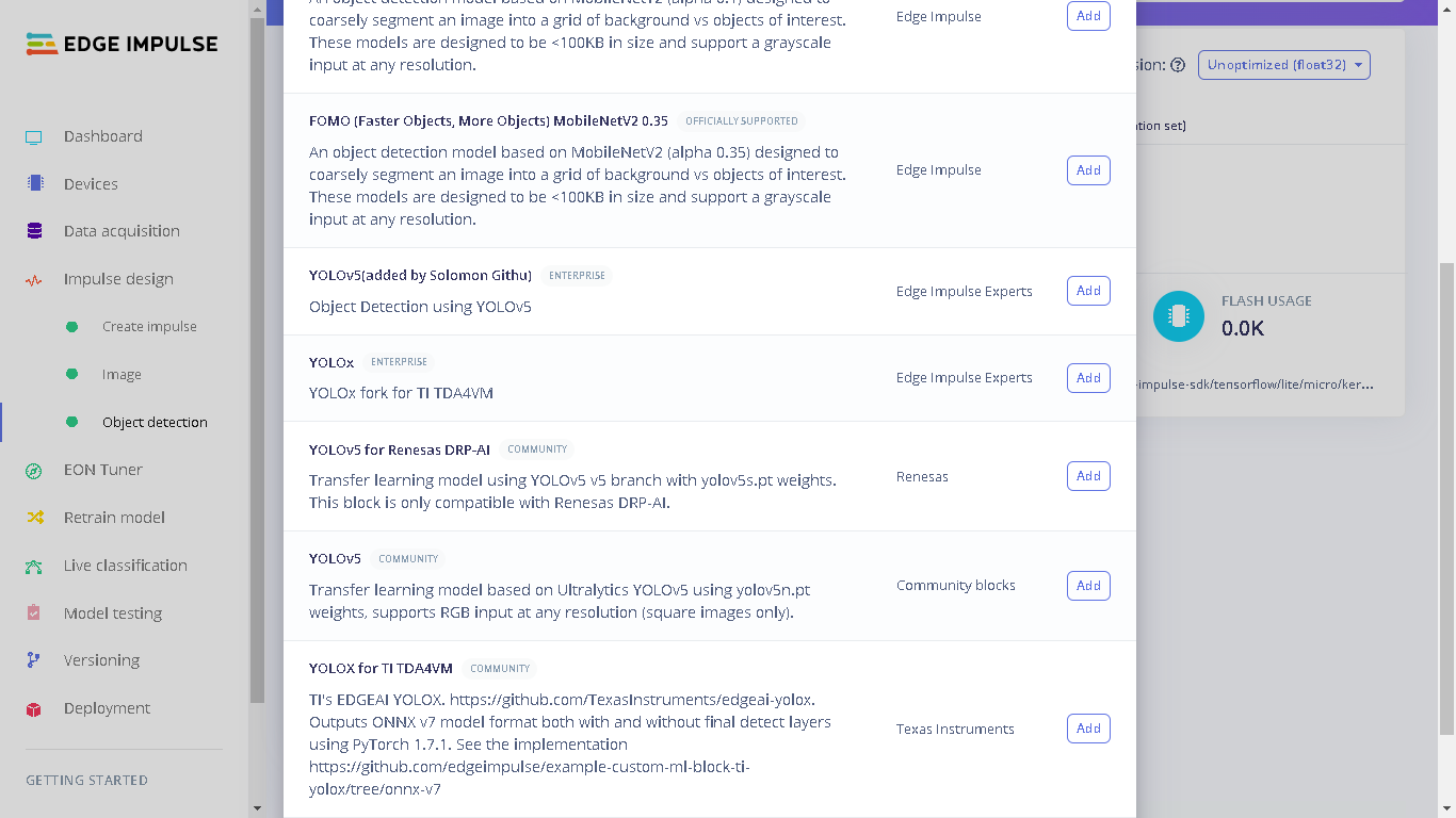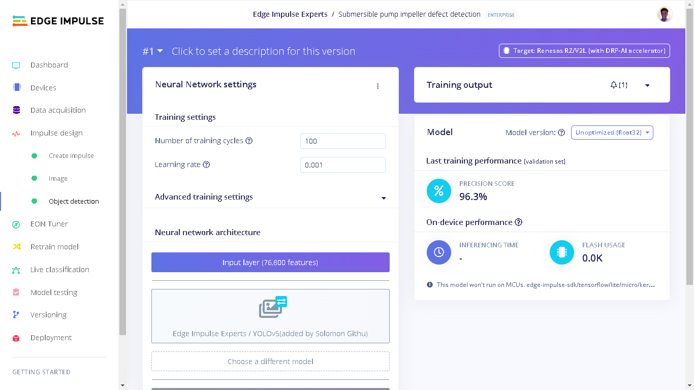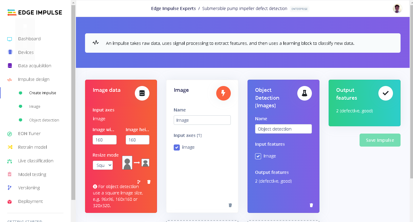 An Impulse is a machine learning pipeline that indicates the type of input data, extracts features from the data and finally a neural network is created that trains on the features from your data. For the YOLOv5 model, I used an image width and height of 160 pixels and the “Resize mode” set to “Squash”. The processing block was set to “Image” and the learning block set to “Object Detection (Images)”.