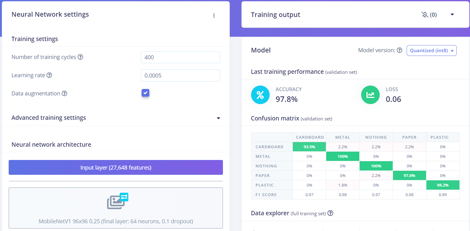 The steps to build, train, and test the waste classification model are close to identical as the ones in Part 1, with the following comments:- Also here, I knew beforehand that the 256 kB RAM memory would put some constraints on what model configuration to use. Following that, I chose to use an image size of 96x96 pixels when creating the impulse, and MobileNetV1 when later training the model.