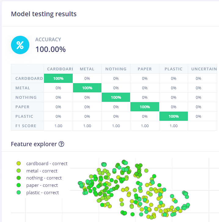 - In my case, the testing resulted in 100% accuracy, thus even better than the training performance. However, as only a very few of the images taken with Arducam might have ended up in the test category, and those images might be more challenging to predict, I wanted to confirm the model performance in real situations before taking the 100% for granted!