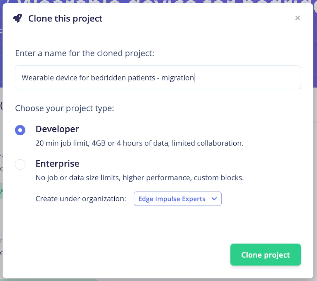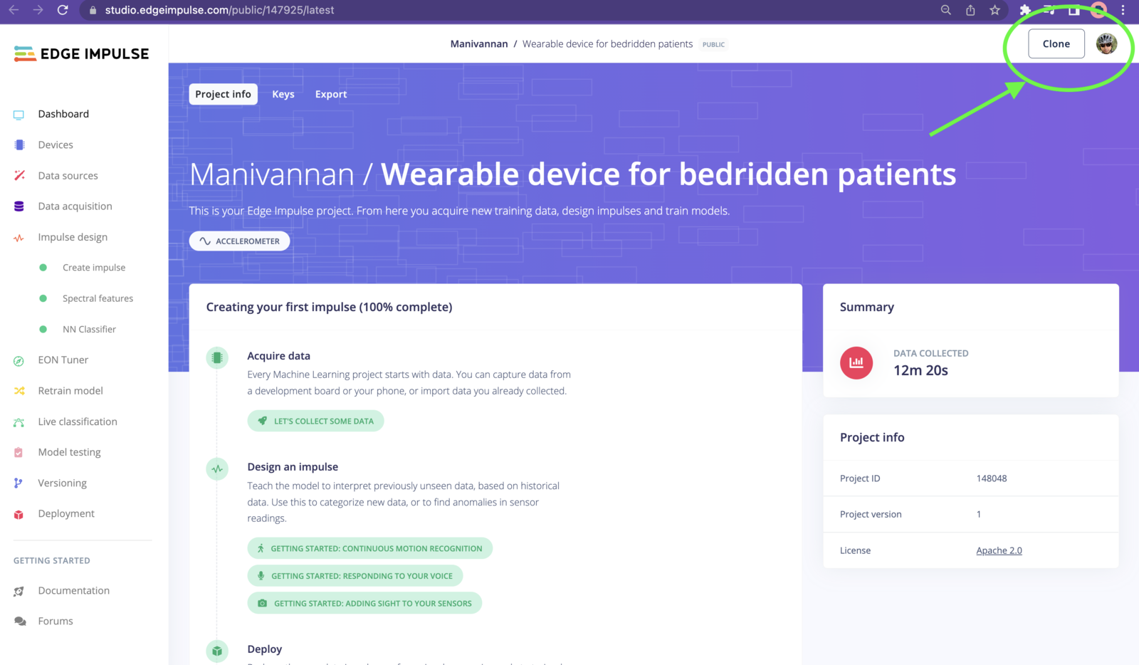 If you don’t have an Edge Impulse account, signup for free and log into Edge Impulse. Then visit the below Public Project to get started. https://studio.edgeimpulse.com/public/147925/latest Click on the “Clone” button at top-right corner of the page.