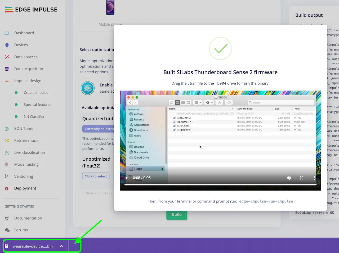 When you are done retraining, navigate to the “Deployment” page from the left menu, select “SiLabs Thunderboard Sense 2” under “Build firmware”, then click on the “Build” button, which will build your model and download a.bin file used to flash to the board.