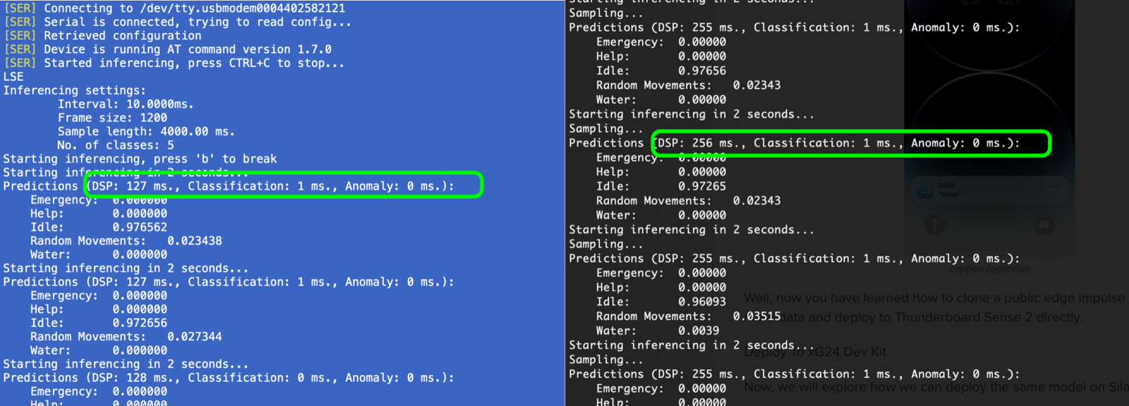 Now, we will explore how we can deploy the same model to the newer Silabs xG24 hardware instead. Keep in mind that there are some upgrades and differences between the Thunderboard Sense 2 and the xG24, and the not all of the sensors themselves are identical (some are though). For this project specifically, the original work done by Manivannan recorded data from the Thunderboard’s IMU, but the xG24 has a 6-axis IMU. So, we should recollect new data to take advantage of this and ensure our data is applicable. If your use-case is simple enough that new data won’t data won’t be needed, the sensor you are using is identical between the boards, or that your data collection and model creation steps built a model that is still reliable you might be able to skip this. If your data is indeed simple enough, you can deploy the model straight to an xG24 without making any changes to the model itself. You only need to revisit the “Deployment” tab in the Edge Impulse Studio, select “SiLabs xG24 Dev Kit” under Build firmware, and Build. For the sake of demonstration we will give it a try in this project, though as mentioned the upgrade from 3-axis to 6-axis data really should be investigated, but the sensor itself is identical between the boards so our data should still be valid. We’ll give it a try.