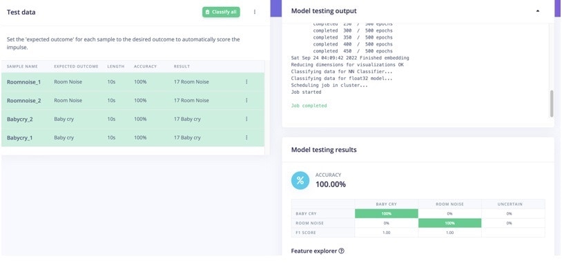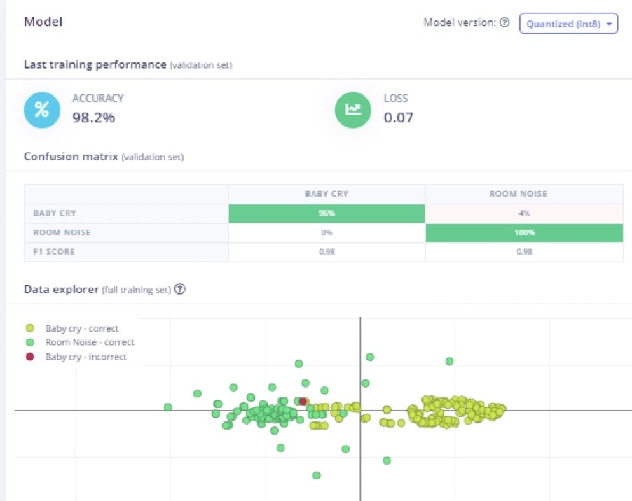 After the model is trained with good accuracy, I have tested with new data. I have used two datasets for each category (baby cry and room noise) for testing. In testing with unseen data, the model achieved 100% accuracy. Then next step is deployment to the hardware.