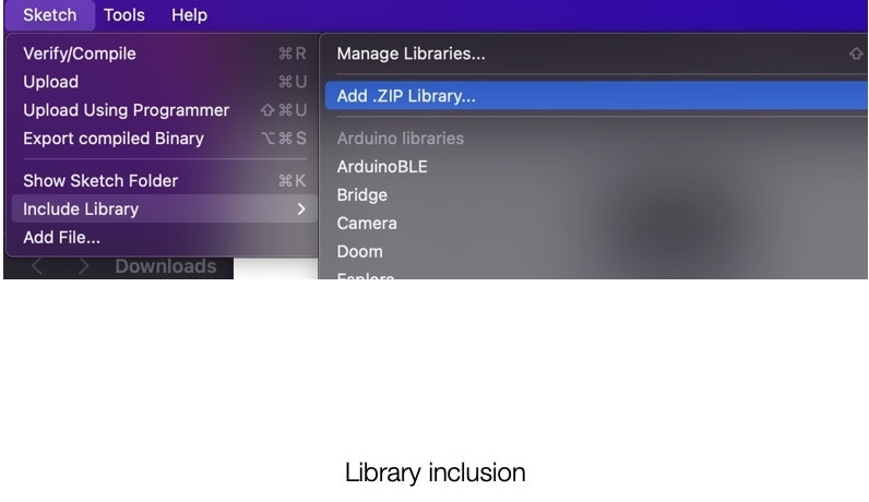 Open the Arduino IDE and select Sketch -> Include library and Add .Zip Library. Then select the downloaded Zip file on your machine.