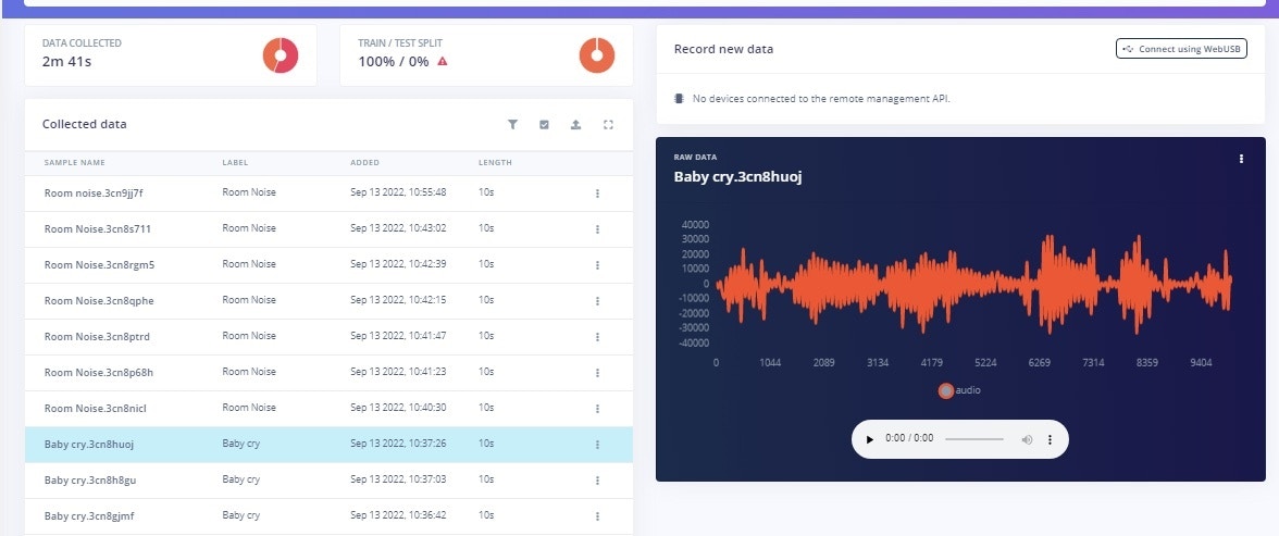 The Portenta is now connected to Edge Impulse. I have collected a dataset of real baby crying sounds and some normal room noise.