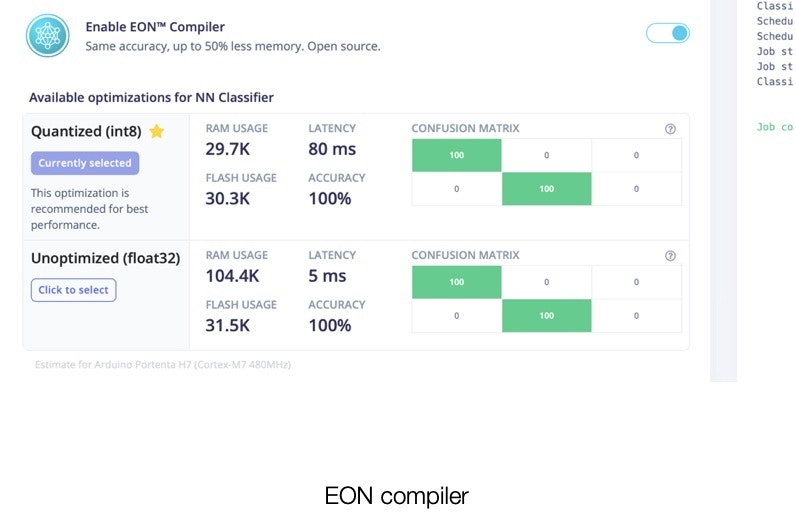 Once the testing is complete, go to the “Deployment” option and select Build firmware -> Arduino Portenta H7 to create a downloadable firmware to flash to the board. I have chosen Quantized (Int8). In Edge Impulse, there is also an option to use the EON compiler for reducing resources and improving accuracy, as well as lower latency.