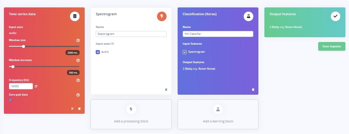 Inside your Edge Impulse account, in the Create Impulse section, the Window Sampling is selected as 2500ms and Window Increase is set as 500ms. I have configured spectrogram as a Preprocessing block.