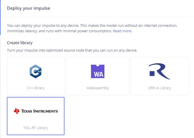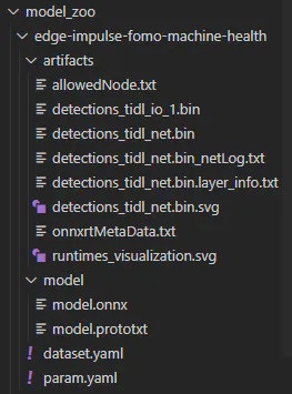 The output of library build is a zip file, however, the contents are in the format for the edge-impulse-linux-runner, and not the TI model zoo format that’s found in the SDK. I organized the model contents into a similar format as the other models in the model zoo: