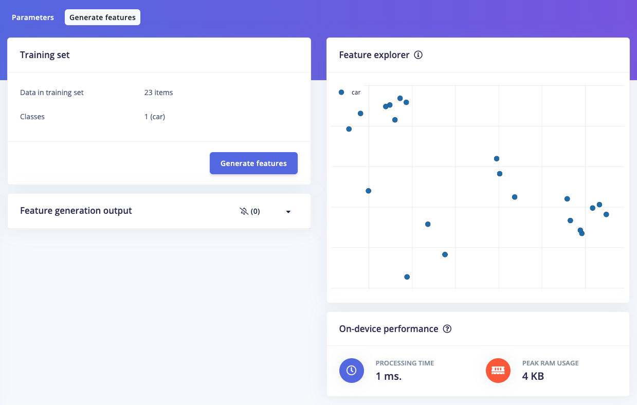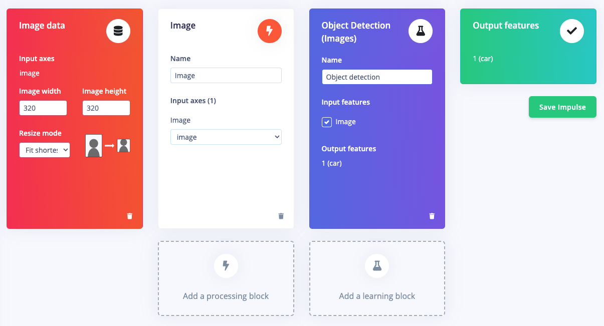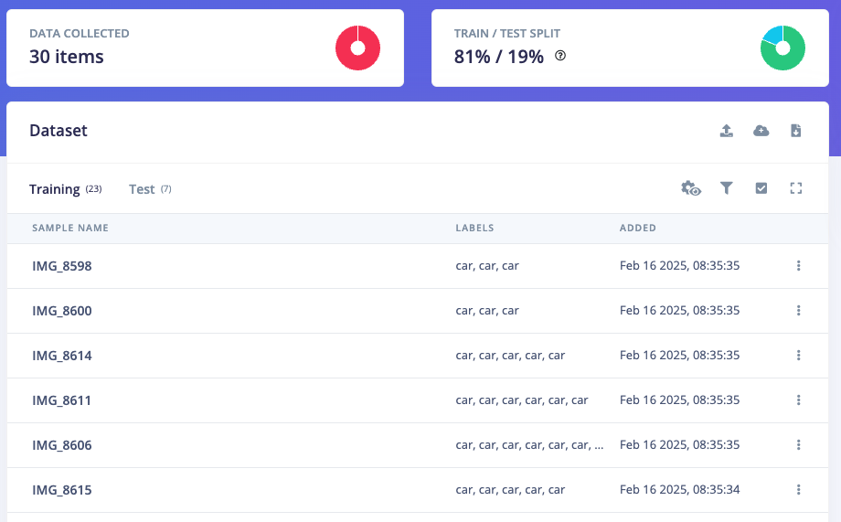 The next step is labeling, now click on Data Acquisition, click on Labeling queue tab, then drag a box around an object and label it, then click Save. Repeat this until all images are labelled. Alternatively, you can try Edge Impulse’s new feature AI auto labeling to help speed things up. After labeling, it’s recommended to split the data into Training and Testing sets, around an 80/20 ratio. If you haven’t done this yet, click on Train / Test Split to automate this process.