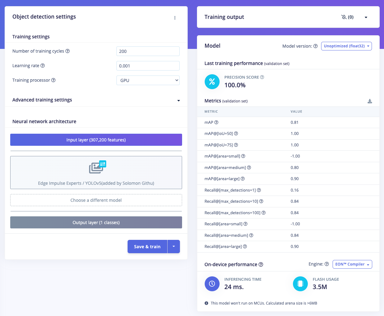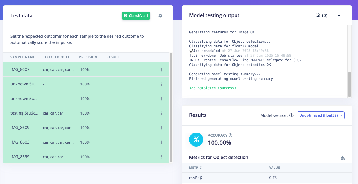 Once your labelled dataset is ready, go to Impulse Design > Create Impulse, and set the image width and height to 320x320. Choose Fit shortest axis, then select Image and Object Detection as the learning blocks, and click Save Impulse. Next, navigate to the Image Parameters section, select RGB as the color depth, and press Save parameters. After that, click on Generate, where you’ll be able to see a graphical distribution of the feature data. Now, move to the Object Detection section and configure the training settings. Select GPU as the processor and set the training cycles to around 200, and learning rate to 0.001. Choose YOLOv5 as the neural network architecture — for higher resolutions (eg. 640x640), you can try YOLOv5 (Community blocks) with a model size of medium (YOLOv5m). Once done, start training by pressing Start training, and monitor the progress. If everything goes well and the precision result is above 80%, proceed to the next step. Go to the Model Testing section, click Classify all, and if the result is around 90%, you can move on to the final step — Deployment.