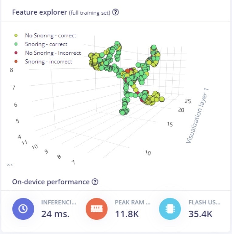 To train the model, the number of epochs was set to 100, the leaning rate assigned after several trials is 0.005, and the overall dataset was split into 80% training and 20% validation set. The number of epochs is the number of times the entire dataset is passed through the neural network during training. There is no ideal number for this, and it depends on the data. In Figure 8 we can see the feature explorer for correct and incorrect classification of both classes.