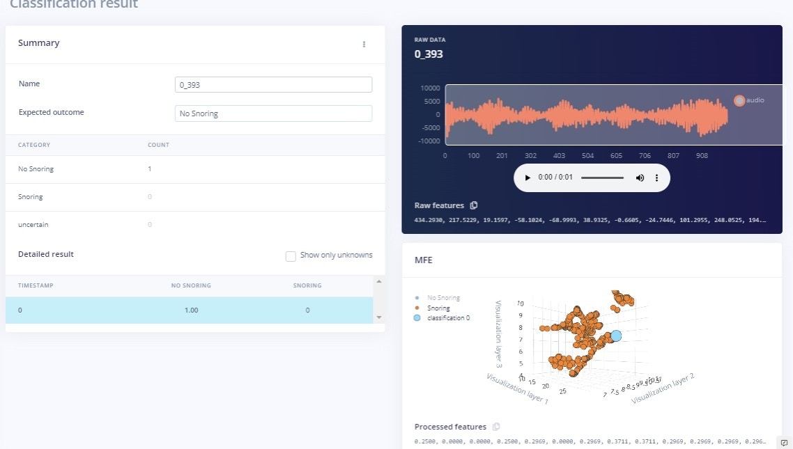 The Live classification page allows us to test the algorithm both with the existing testing data that came with the dataset, or by streaming audio data from your mobile phone or on any microcontroller with audio data processing compatibility. We can start with a simple test by choosing any of the test samples and pressing ‘Load sample’. This will classify the test sample and show the results: in Figure 11 and 12 respectively for both classes with their probability score. We can also test the algorithm with live data. Start with your mobile phone by refreshing the browser page on your phone. Then select your device in the ‘Classify new data’ section and press ‘Start sampling’ as shown in Figure 15.