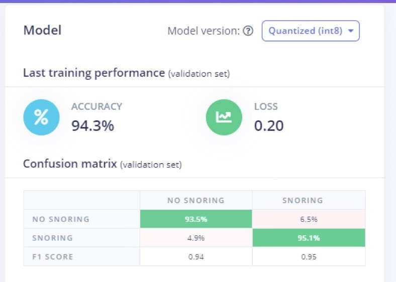 This project provides insights of TinyML deployment on a smartphone. In this project, a deep learning model for snoring detection is trained, validated, and tested. A prototype system comprising of a listener module for snoring detection was demonstrated. For future work, extend the default dataset with your own data and background sounds, remember to retrain periodically, and test. You can set up unit tests under the Testing page to ensure that the model is still working as it is extended.References