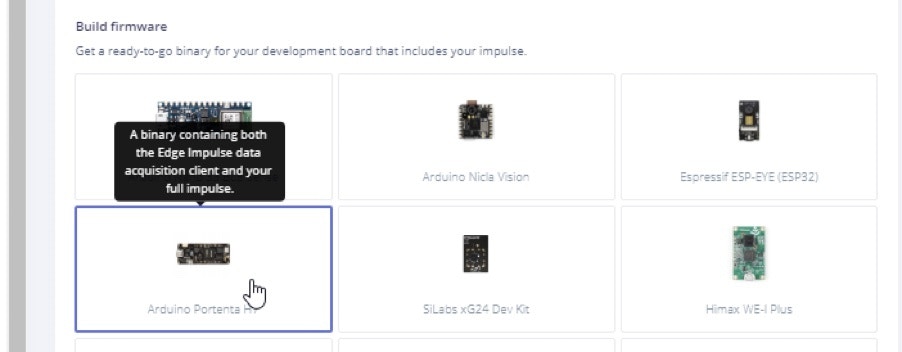 Go to the Deployment section and select Build firmware with Arduino Portenta H7 and download the firmware. Then press the Reset button twice to get into the boot loader mode again and open the downloaded script to flash it, similar to earlier.