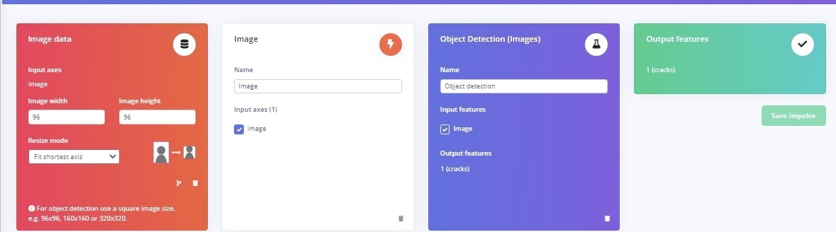 In the Create Impulse section, I have selected Object detection and set a Pixel size of 96x96.
