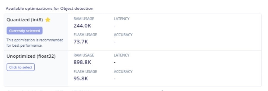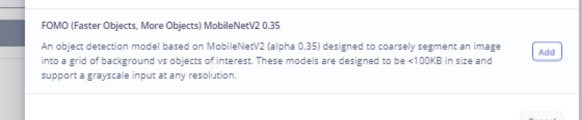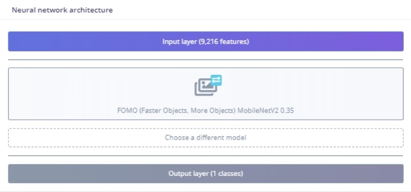In the Object detection section, I have selected the FOMO model — FOMO (Faster Objects, More Objects) MobileNetV2 0.35
