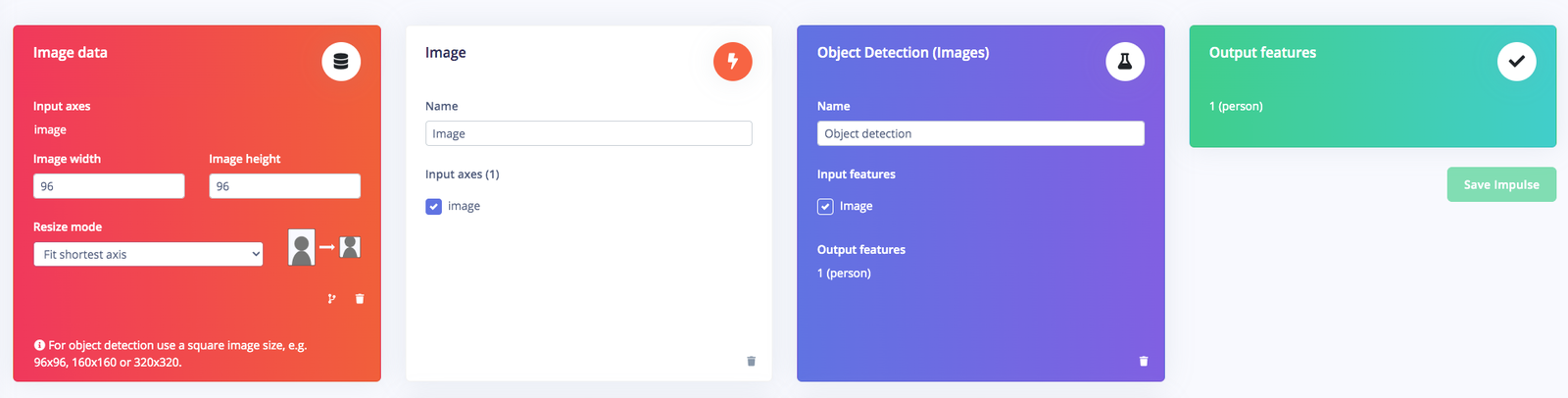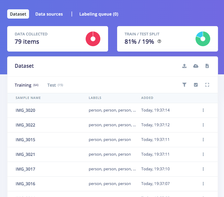 Open studio.edgeimpulse.com, login (or create an account first), then create a new Project. Choose the Images project option, then Classify Multiple Objects. In Dashboard > Project Info, choose Bounding Boxes for labelling method and Sony Spresense for target device. Then in Data acquisition, click on Upload Data tab, choose your photo files, auto split, then click Begin upload. Click on Labelling queue tab then start drag a box around an object and label it (person) and Save. Repeat until all images are labelled.