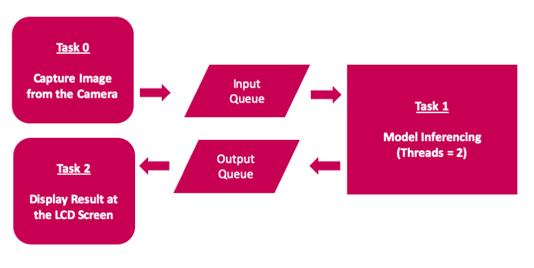 The application implements multithreading to use all available 4-cores on the Raspberry Pi 4 Compute Module to achieve low latency and better FPS.