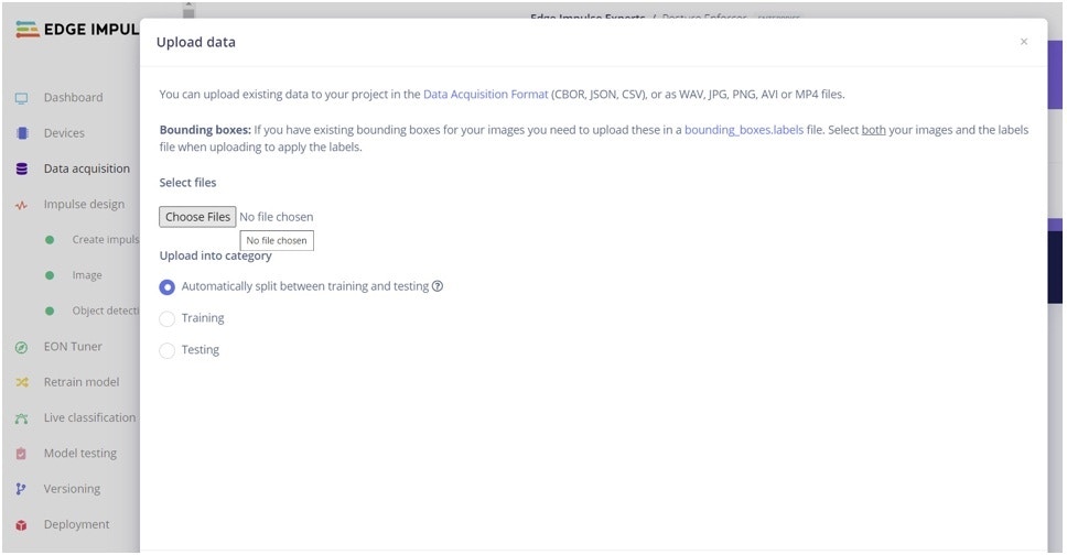 For Machine Learning I will use Edge Impulse. The platform is free for developers and the link to sign up for a new account is https://studio.edgeimpulse.com/signup Note: for testing purposes you can skip the data acquisition phase, since you can clone my entire Edge Impulse project. Data is the foundation of any Machine Learning project and in this case data means pictures. I have selected the correct board for calculation in the EI Dashboard and also Bounding Boxes as the Labeling method.