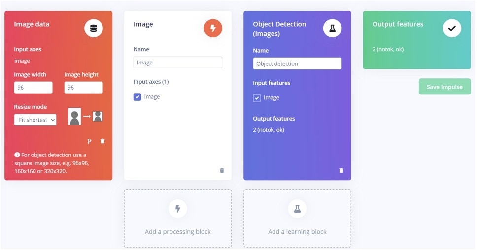 With all the pictures uploaded and labeled, the next phase in the process is the Impulse Design. I clicked on Create Impulse and I used the following parameters:- First block is Image Data, 96x96 pixels, Resize fit shortest axis. Then Image for the Processing block. Then Object Detection for the Learning block. You can read more about these blocks here.