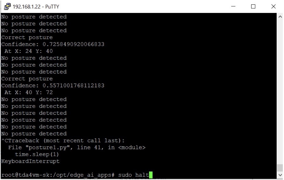 Download the posture1.py Python script from https://github.com/ronibandini/tda4vmPostureEnforcer, and then upload the script with FTP to /opt/edge_ai_apps on the TDA4VM.
