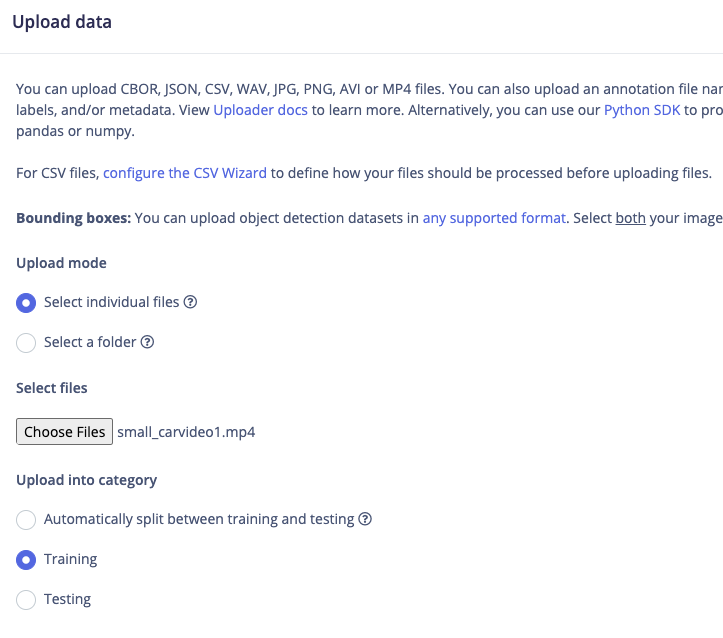 In the initial stage of building a model in Edge Impulse Studio, we need to prepare the data, which can be in the form of images or videos that will later be split into images. The image and video data can be sourced from free-license databases such as the COCO dataset or Roboflow, which can then be used for object detection training. Alternatively, you can collect your own data to better suit the purposes of your project. Here, I will provide an example of how to upload data in Edge Impulse Studio for both scenarios (see the images below). For those who are not familiar with Edge Impulse Studio, simply visit https://studio.edgeimpulse.com, login or create an account, then create a new Project. Choose Images when given a choice of project type, then Object detection. In Dashboard > Project Info, choose Bounding Boxes for the labeling method and NVIDIA Jetson Orin Nano for the target device. Then move to Data acquisition (on the left hand navigation menu), and click on the Upload Data tab.Note: When collecting data samples, it’s important to remember that the images of vehicles (trucks or cars) to be labeled should not be too small, as the model we’re building can only recognize objects with a minimum size of 32x32 pixels.
