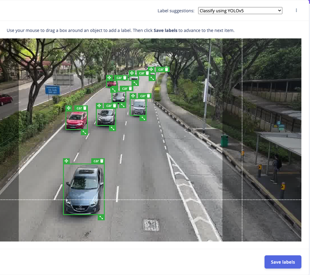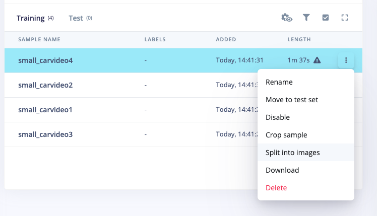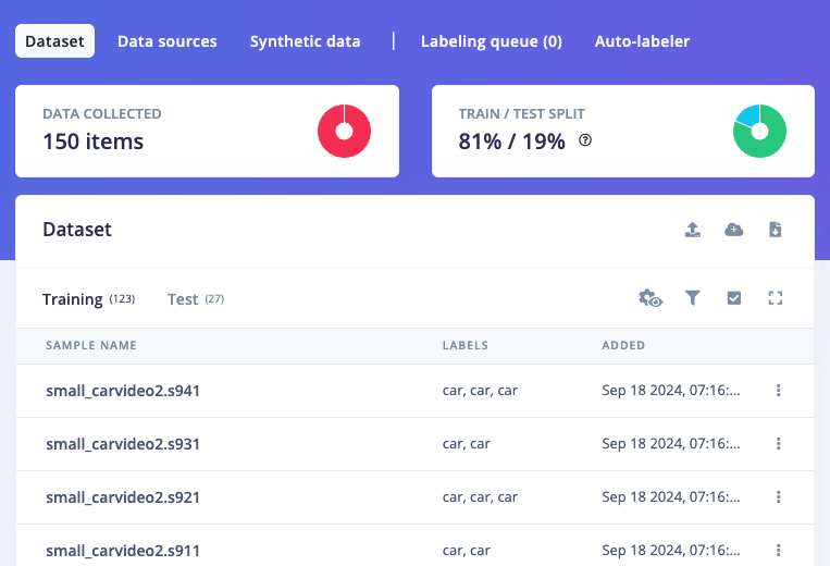 The next step is labeling. If you’re using data from a COCO JSON dataset that has already been annotated, you can skip this step or simply review or edit the existing labels. For other methods, click on Data acquisition, and before labeling video data, you’ll need to split the video into images. Right-click on the three dots to the right, select Split Into Images, then click Yes, Split. Enter the number of frames per second from the video — usually around 1 or 2 — to avoid having too many nearly identical images. Once the images are ready, you’ll see a labeling queue, and you can begin the process. To simplify this, you can select Label suggestions: Classify using YOLOv5, since cars and trucks will be automatically recognized. Turn off other objects if YOLOv5 detects them incorrectly, then click Save label. Repeat this process until all images are labeled. After labeling, it’s recommended to split the data into Training and Testing sets, using around an 80/20 ratio. If you haven’t done this yet, you can go back to the Dashboard, and click on Train / Test Split and proceed. As shown here, I only used 150 images, as we’ll be training the model with the help of pre-trained NVIDIA TAO-YOLO based models.