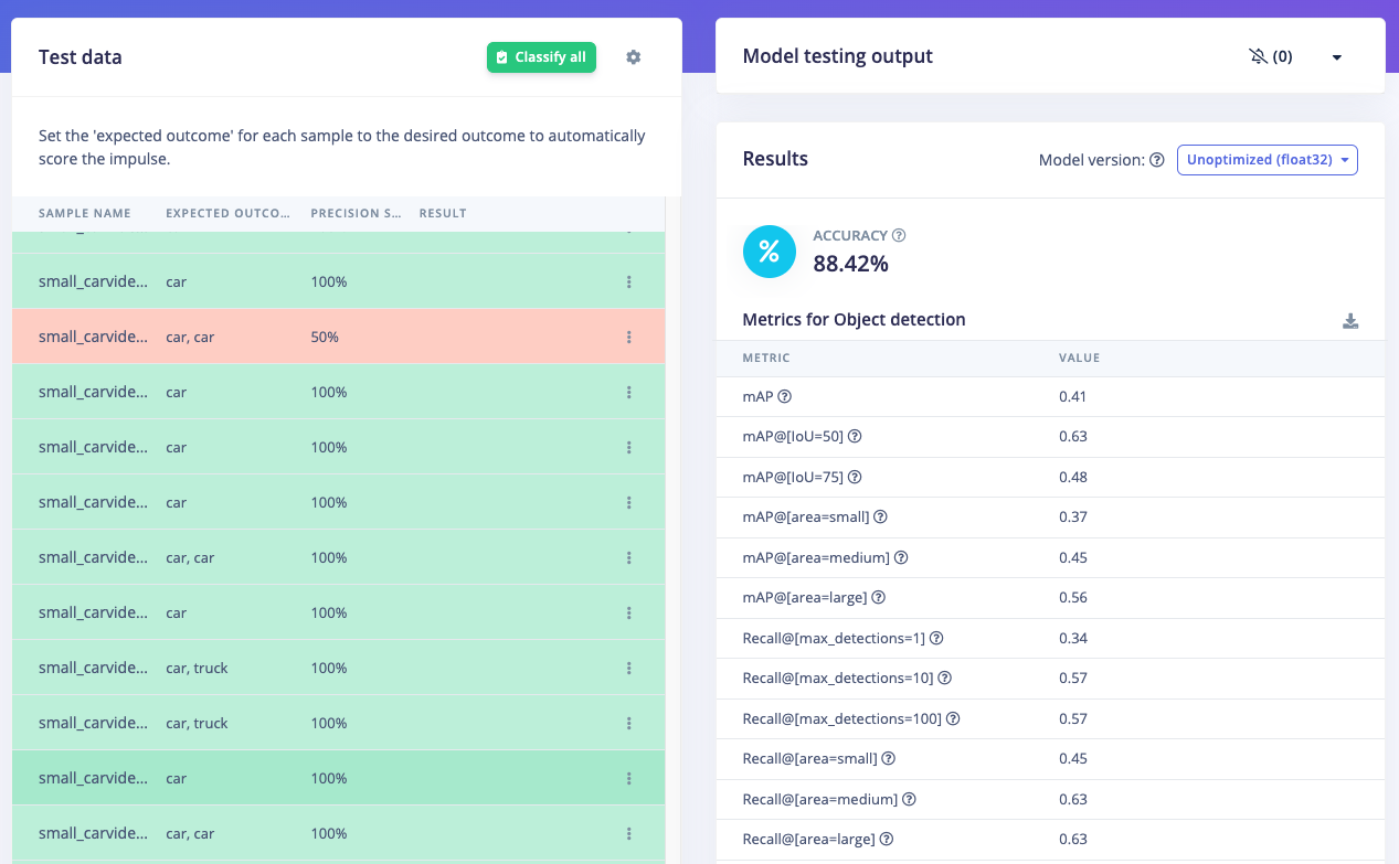 Once your labelled dataset is ready, go to Impulse Design > Create Impulse, and set the image width and height to 320x320. Choose Fit shortest axis, then select Image and Object Detection as the Learning and Processing blocks, and click Save Impulse. Next, navigate to the Image Parameters section, select RGB as the color depth, and press Save parameters. After that, click on Generate, where you’ll be able to see a graphical distribution of the two classes (car and truck). Now, move to the Object Detection navigation on the left, and configure the training settings. Select GPU as the compute option and MobileNet v2 (3x224x224) as the backbone option. Set the training cycles to around 400 and the minimum learning rate to 0.000005. Choose NVIDIA TAO YOLOv4 as the neural network architecture — for higher resolutions (eg. 640x640), you can try YOLOv5 (Community blocks) with a model size of medium (YOLOv5m) — Once done, start training by pressing Start training, and monitor the progress. If everything goes well and the precision result is around 80%, proceed to the next step. Go to the Model Testing section, click Classify all, and if the result is around 90%, you can move on to the final step — Deployment.