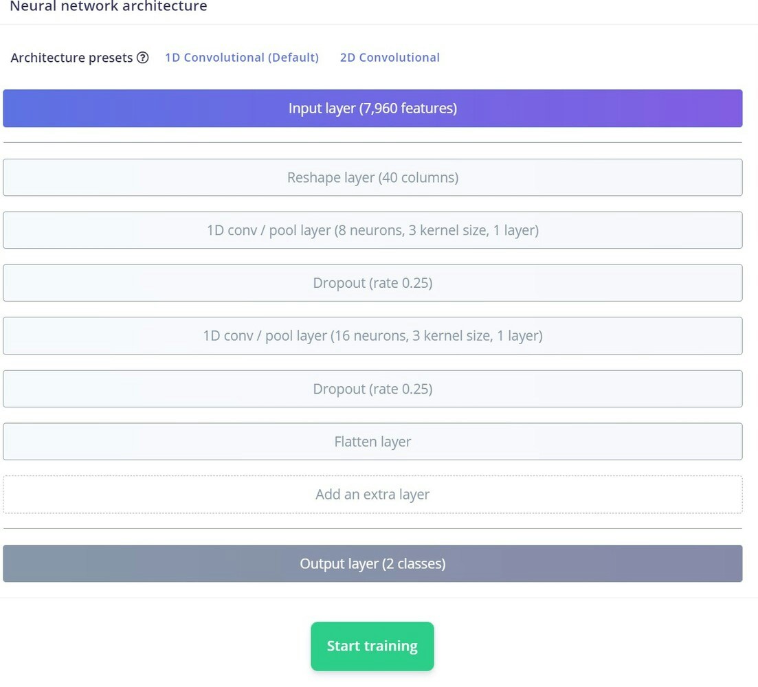 One of the most important parts of any machine learning model is its dataset. Edge Impulse offers us two options to create our dataset: either direct uploading of files, or recording data from actual the device itself. For this project we chose to record data with the device itself, because as a prototype, the data will be limited. A second reason to record data with the device itself is that it can improve accuracy. To get started connecting the Nano 33 BLE Sense to Edge Impulse, you can have a look at this tutorial. In this scenario, we have only two classes Glass Break, and Noise. Glass breaking sounds that we have used are from the vivid online resources and the major noise datasets are from the Microsoft Scalable Noisy Speech Dataset (MS-SNSD). We also included the natural noise in the room, apart from the MS-SNSD data. The sound recording was done for 20 seconds at a 16KHz sampling rate. Something to keep in mind is that you must keep the sampling rate the same between your training dataset and your deployment device. If you are training with 44.1Khz sound, you need to downsample it to 16KHz when you are ready to deploy to the Arduino. We collected around 10 minutes of data and split it between Training and a Test set. In the Training data we split the samples to 2s, otherwise the inferencing will fail because the BLE Sense has a limited amount of memory to handle the data.
