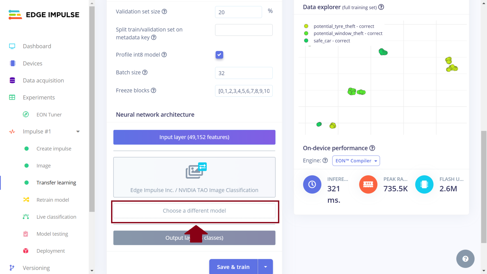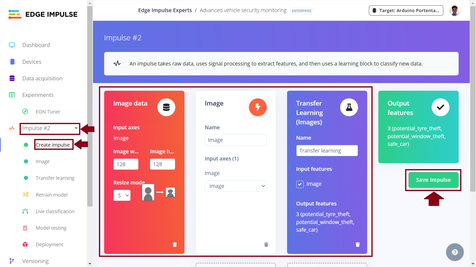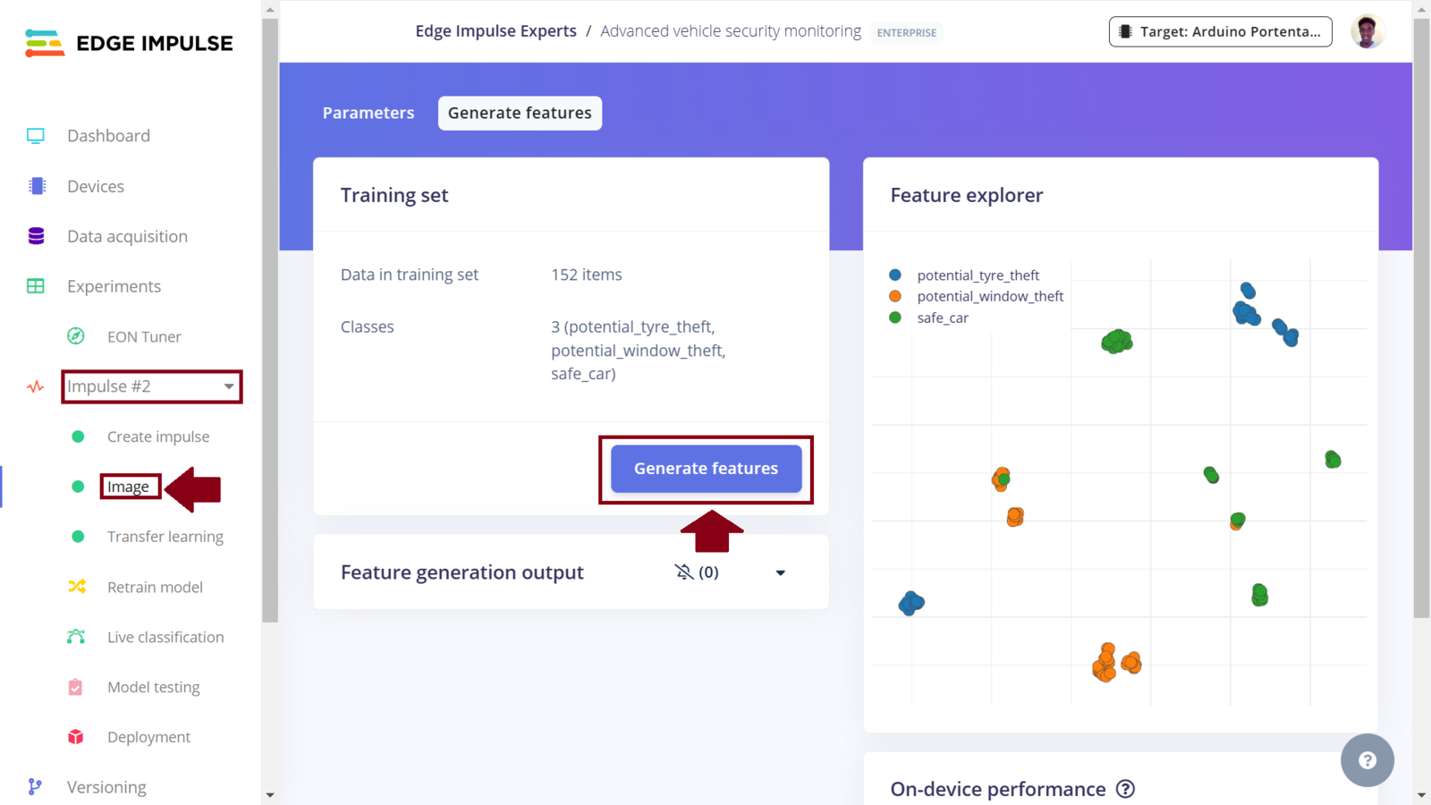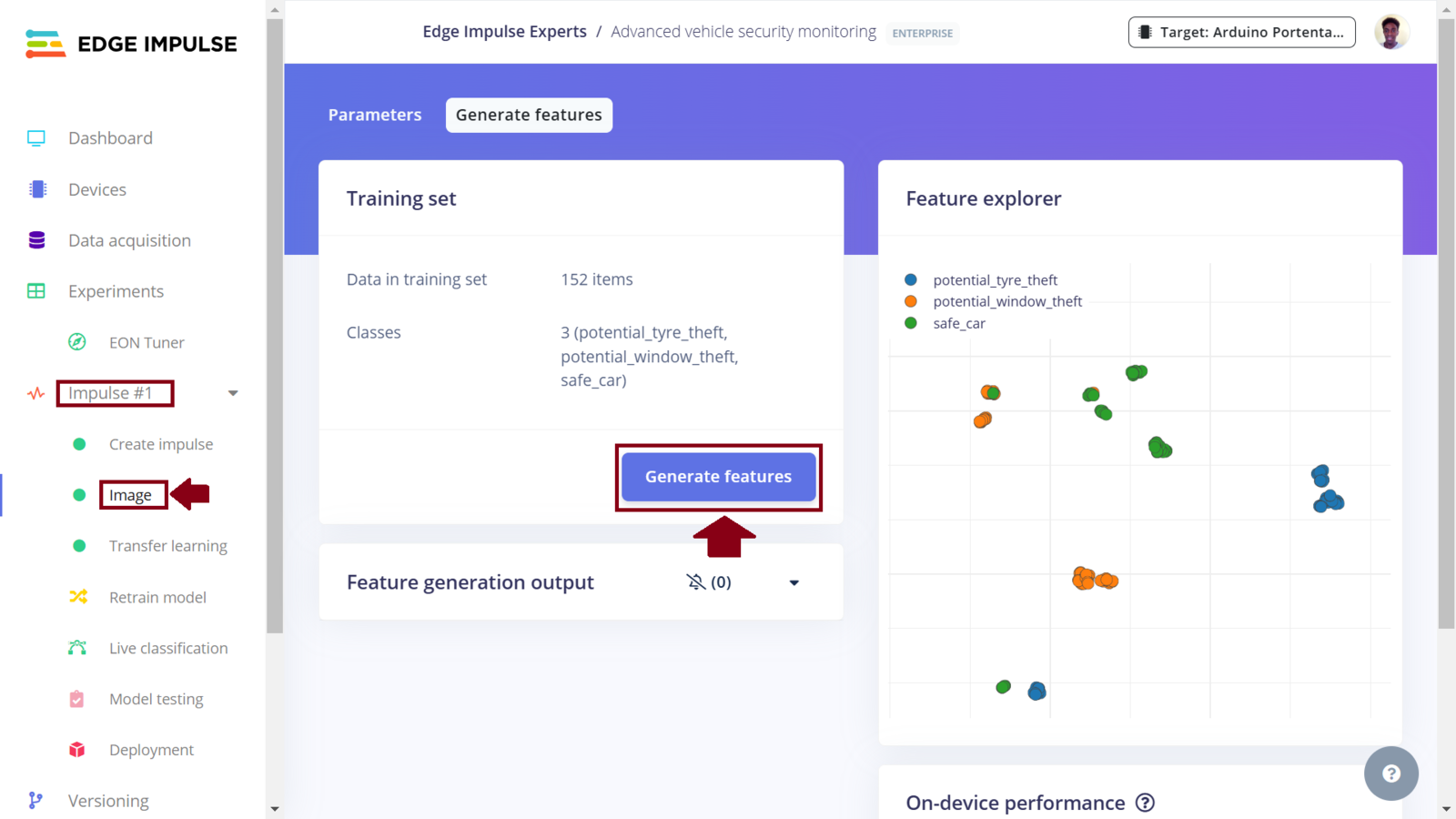 In this project, a Machine Learning model will be classifying images into three classes: safe_car, potential_window_theft and potential_tire_theft for three situations where a car is safe, someone is seen tampering with a window, or tire respectively. In Machine Learning, it is best to train a model with data that is a good representation of what the model will see when it is deployed. In this case, instead of relying on open source car images datasets, I opted to collect custom data by simulating vehicle tampering scenarios in a controlled environment. Using a personal car in a compound, I safely acted out scenarios that I was tampering with the car tires and attempting to break the windows. During these simulations, the Arduino Portenta H7 was capturing images and automatically uploading them to an Edge Impulse project, ensuring the dataset was both relevant and tailored for the task. Since the Arduino Portenta H7 is fully supported by Edge Impulse, the data collection process is easy. Following the Edge Impulse documentation we first download the Edge Impulse data collection firmware for the Portenta H7. This firmware allows us to collect sensor data from the Portenta H7 (such as an image or sound) and automatically have the data uploaded to an Edge Impulse project. Using a USB-C cable with data transfer, connect the Portenta H7 to your computer and double-press the reset button to put it in bootloader mode (this allows us to update the device’s firmware). Run the flashing script according to your Operating System and then press the reset button once to launch the new firmware. Edge Impulse has also created a short and comprehensive video tutorial on these steps. Next, create a project in the Edge Impulse Studio platform. Before starting to work on the project, I prefer informing the platform about the device that I am targeting. To do this we can click the “Target” button on the top right section of the page and select “Arduino Portenta H7 (Cortex-M7 480MHz)” from the dropdown list for “Target device”. When you set the target device in the Studio (or using the Python SDK), it automatically generates on-device performance metrics for tasks such as the digital signal processing, model’s classification time, and RAM and ROM usage. This information is invaluable as it provides insights into how efficiently the digital processing and model will perform on the targeted device, such as the Portenta H7. Most importantly, the information also assists us to determine whether the processing algorithm and model are capable of “fitting” within the constraints of the target device.