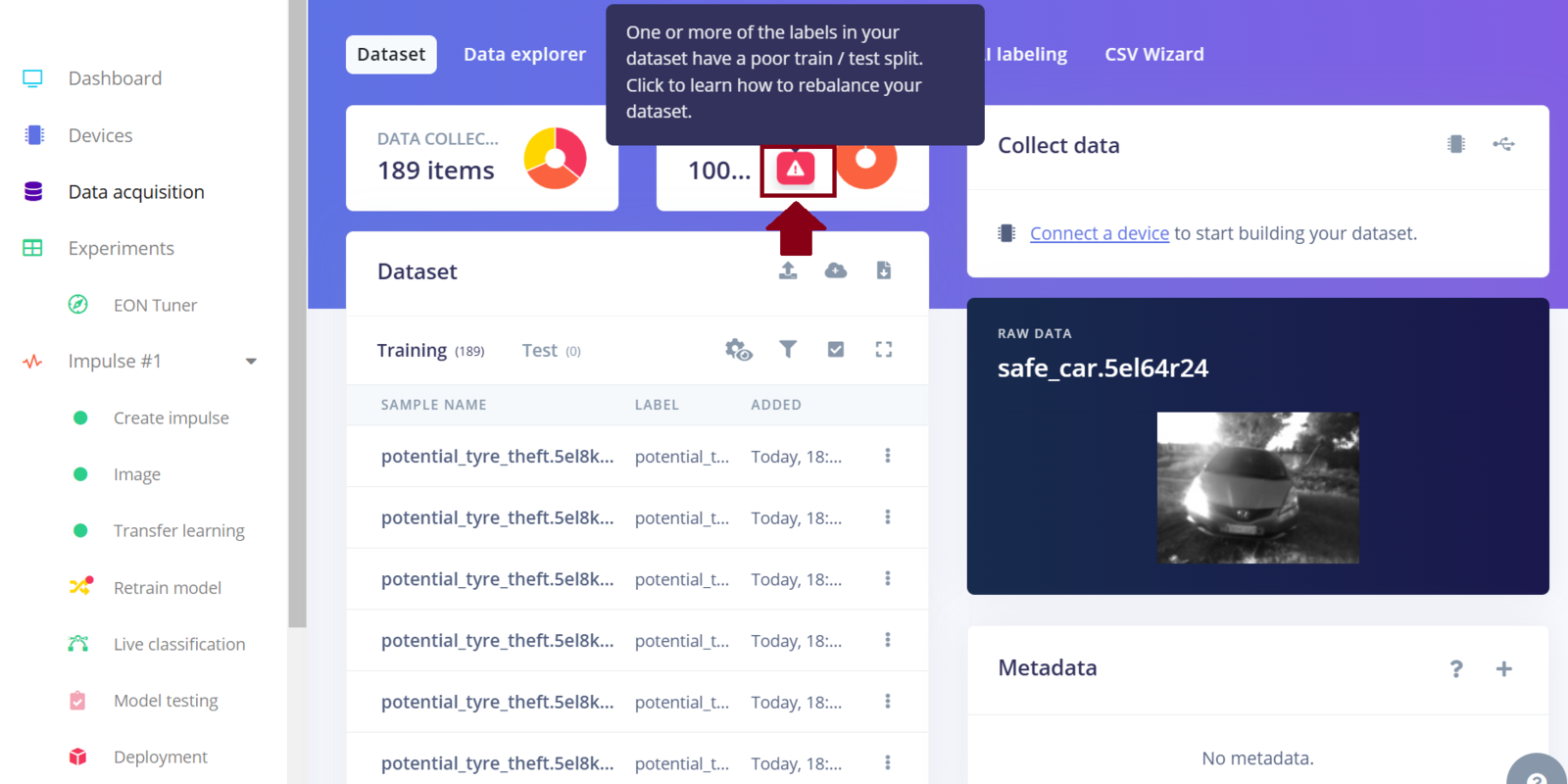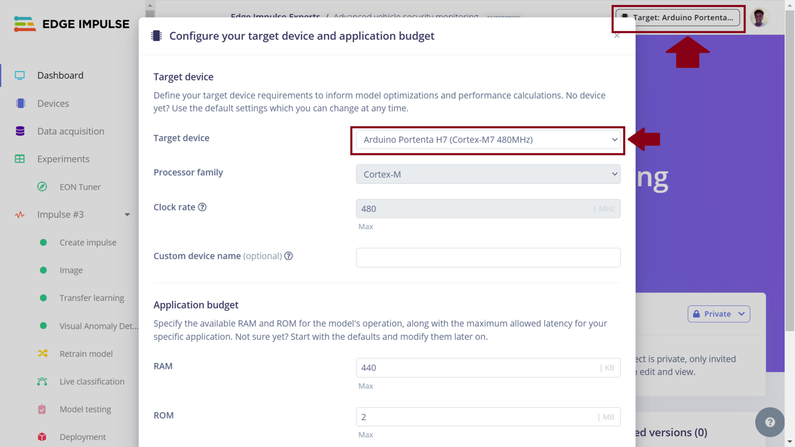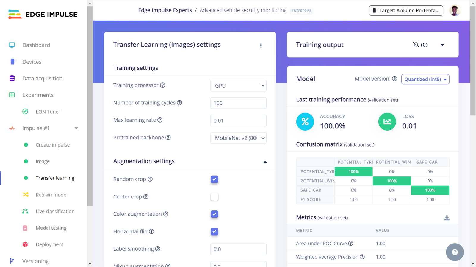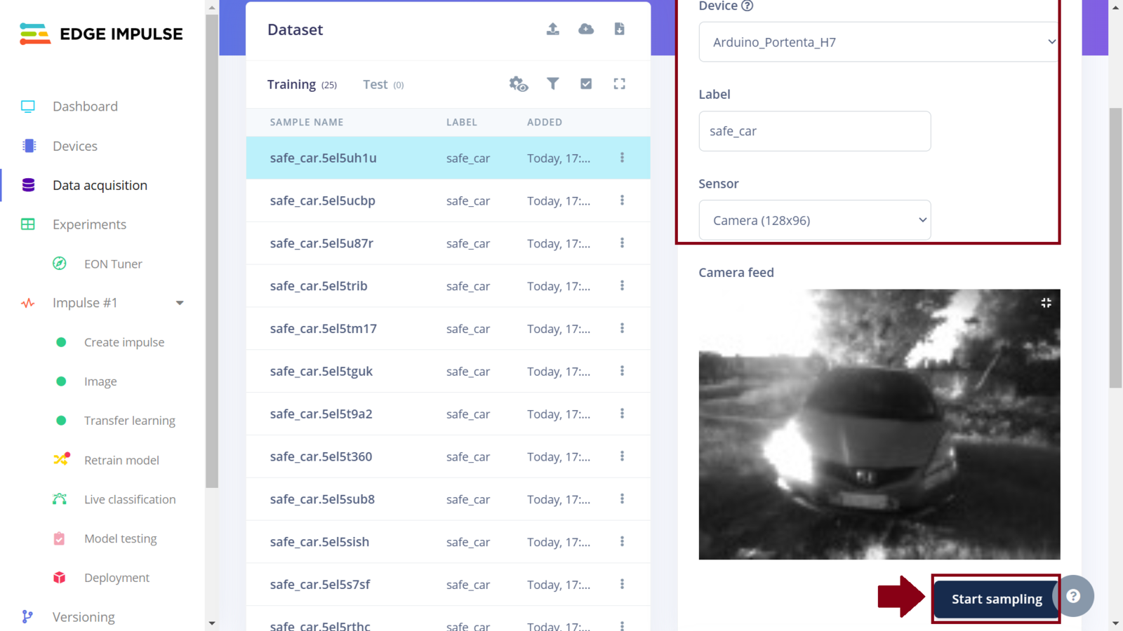 In this project, a Machine Learning model will be classifying images into three classes: safe_car, potential_window_theft and potential_tire_theft for three situations where a car is safe, someone is seen tampering with a window, or tire respectively. In Machine Learning, it is best to train a model with data that is a good representation of what the model will see when it is deployed. In this case, instead of relying on open source car images datasets, I opted to collect custom data by simulating vehicle tampering scenarios in a controlled environment. Using a personal car in a compound, I safely acted out scenarios that I was tampering with the car tires and attempting to break the windows. During these simulations, the Arduino Portenta H7 was capturing images and automatically uploading them to an Edge Impulse project, ensuring the dataset was both relevant and tailored for the task. Since the Arduino Portenta H7 is fully supported by Edge Impulse, the data collection process is easy. Following the Edge Impulse documentation we first download the Edge Impulse data collection firmware for the Portenta H7. This firmware allows us to collect sensor data from the Portenta H7 (such as an image or sound) and automatically have the data uploaded to an Edge Impulse project. Using a USB-C cable with data transfer, connect the Portenta H7 to your computer and double-press the reset button to put it in bootloader mode (this allows us to update the device’s firmware). Run the flashing script according to your Operating System and then press the reset button once to launch the new firmware. Edge Impulse has also created a short and comprehensive video tutorial on these steps. Next, create a project in the Edge Impulse Studio platform. Before starting to work on the project, I prefer informing the platform about the device that I am targeting. To do this we can click the “Target” button on the top right section of the page and select “Arduino Portenta H7 (Cortex-M7 480MHz)” from the dropdown list for “Target device”. When you set the target device in the Studio (or using the Python SDK), it automatically generates on-device performance metrics for tasks such as the digital signal processing, model’s classification time, and RAM and ROM usage. This information is invaluable as it provides insights into how efficiently the digital processing and model will perform on the targeted device, such as the Portenta H7. Most importantly, the information also assists us to determine whether the processing algorithm and model are capable of “fitting” within the constraints of the target device.